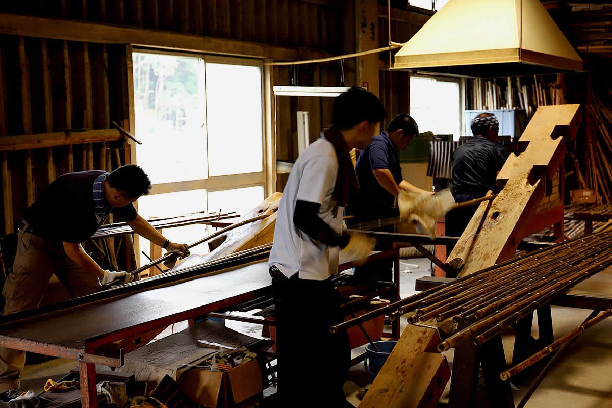 熱くなった竹の繊維を伸ばしながら、水をつけて冷却し、また元の曲りがある状態に戻ってしまわないように整えるという巧みな職人技により、真っ直ぐで美しい竹材が生み出されます。竹を加工する際にこのような製竹作業が行われている事をご存じない方は少なくありません。竹に関わる伝統技術や竹文化についての理解を広めるため、工場見学やインターンシップ、マスコミ取材の際には必ず製竹作業をご覧いただいています。