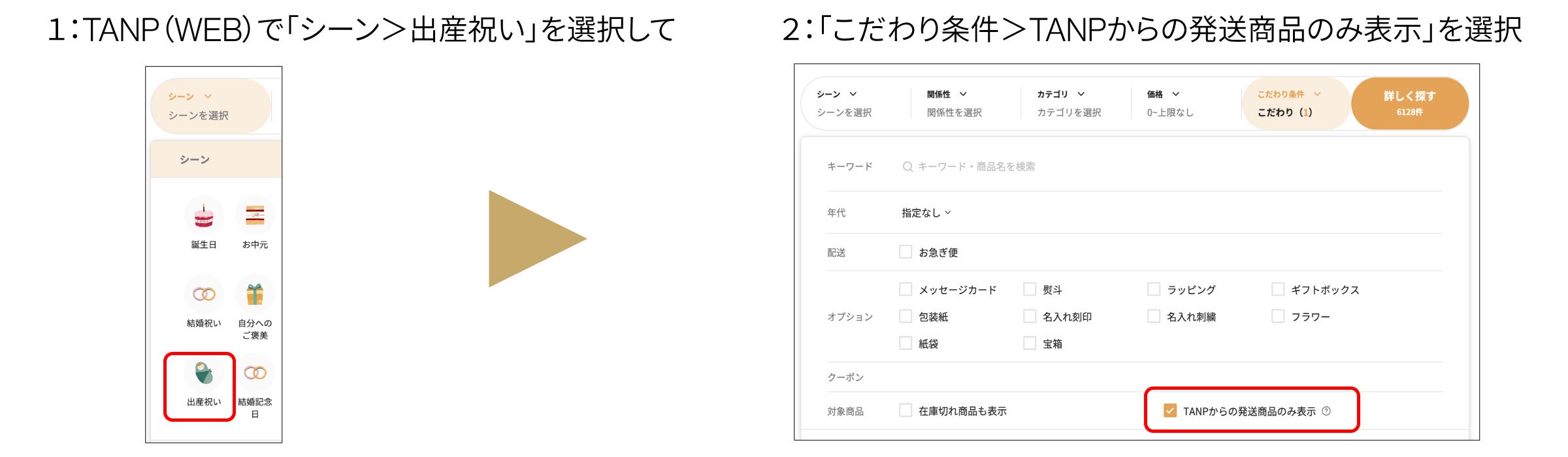 TANP(WEB)の検索にて「シーン:出産祝い」「こだわり条件:TANPからの発送商品のみ表示」をご指定ください。