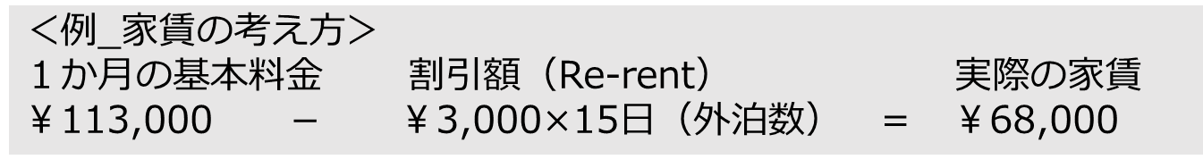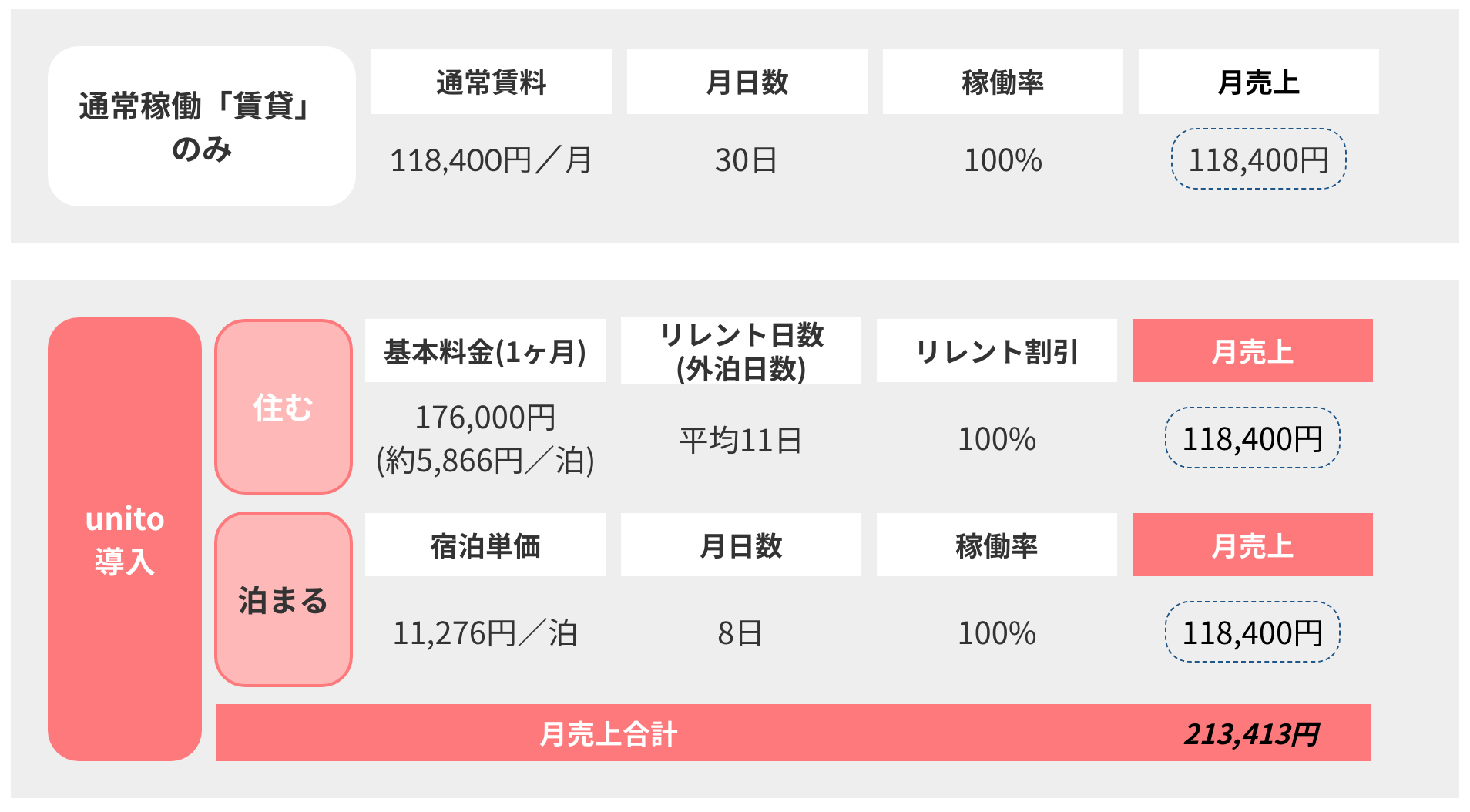 物件の所有者は、入居者から賃貸収益を得られる他、入居者が帰らない日も、1日あたりのリレント費用(入居者が帰らない日数ごと家賃から差し引く費用)よりも、高く設定した宿泊費で、短期の宿泊者を集客することできます。賃貸とホテルの二毛作経営を可能にし、収益の増加を見込めるビジネスモデルです。
