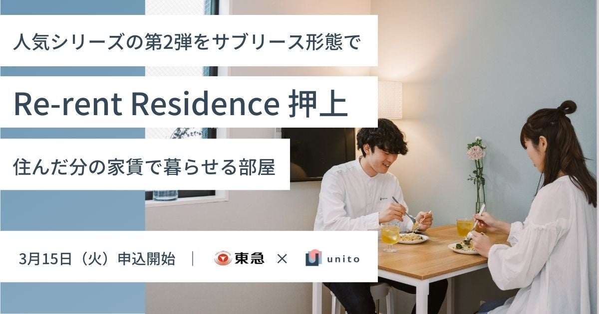 住んだ分だけの家賃で暮らせる部屋を提供するプラットフォーム「unito」を運営する株式会社Unito(東京都千代田区、代表取締役:近藤佑太朗、以下ユニット)は、この度、東急株式会社(以下東急)とユニットの協同事業である多拠点生活向けサービスアパートメント「Re-rent Residence」の第2弾として、「Re-rent Residence 押上」(以下、本物件)1棟8部屋を2022年3月16日(水)に開業することをお知らせします。