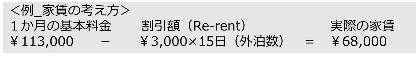 ※リレント可能日数は月15日以内です。入居者が外泊する際は運営スタッフが清掃を行いホテルとして、宿泊者を募集します。なお、宿泊者の利用がない場合でも、外泊数に応じて家賃が減額されます。