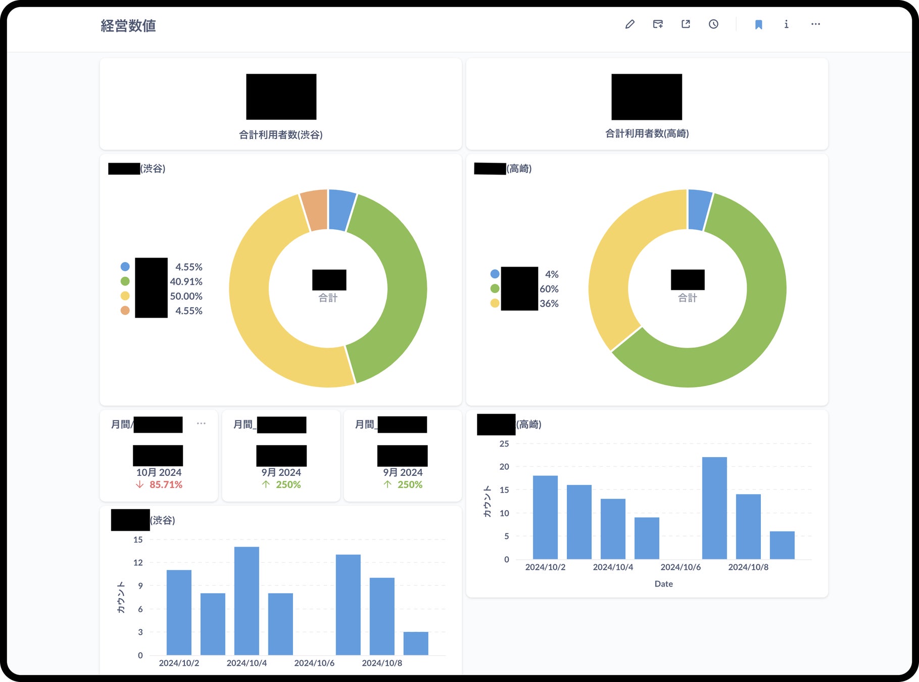 分析ダッシュボードには、Metabaseを導入し、経営関連数値をリアルタイムでグラフで表示できるようにしました。これにより、売上やコスト、利益率などの重要な経営指標を、視覚的に確認可能となりました。