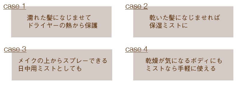 ●for hair 適量を髪全体にスプレーし、根元から毛先まで十分になじませます。