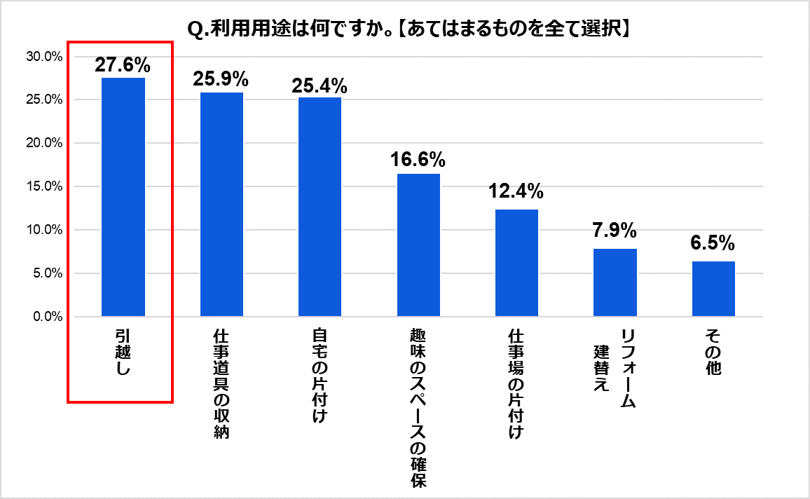 当社の実施した「ハローストレージの利用者調査2022」において、利用用途で最も多かった回答は“引越し”(27.6%)で、トランクルームを引越しで利用される方が多いことが明らかとなっています。衣類や書類、家具や家電などの荷物を一時的に収納する場所として利用されています。