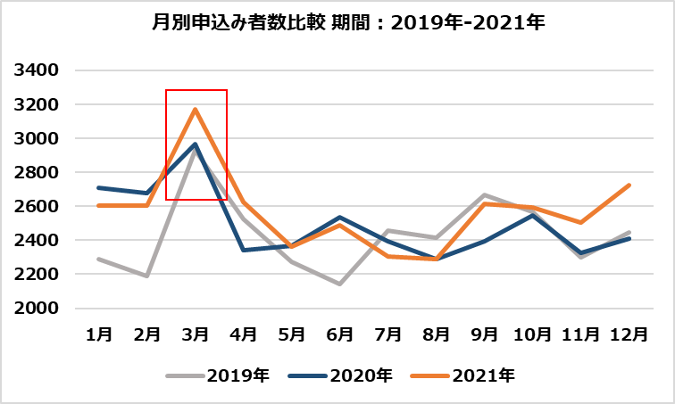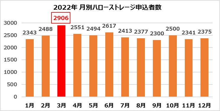 「ハローストレージ」の2022年月別申込者数をみると、3月が2,906名と最も多く、2019年から2021年までの期間においても、最も申込者数が多い月は3月と需要が最も高まる月となっています。新生活が始まる前は、就職や進学による上京や転勤による引越しが多いことが要因として考えられます。