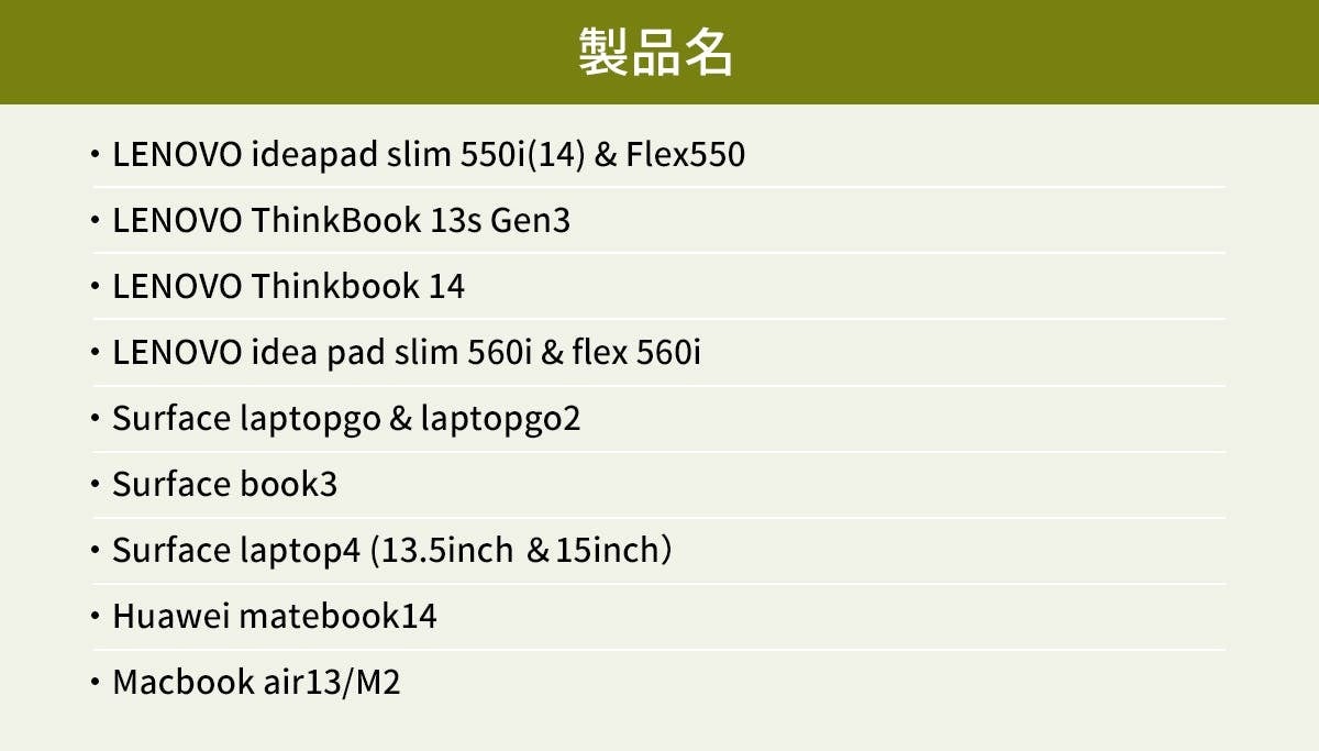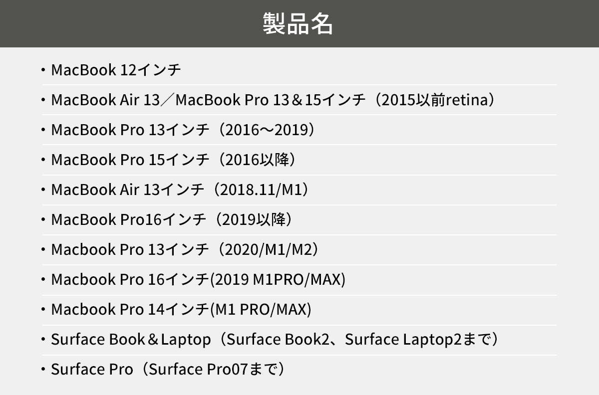 また、Macbook air 13/M2モデル、surface laptop go & laptop go 2、surface book3やlaptop4など、Macbook・surface シリーズの対応機種を大幅に拡大致しました。