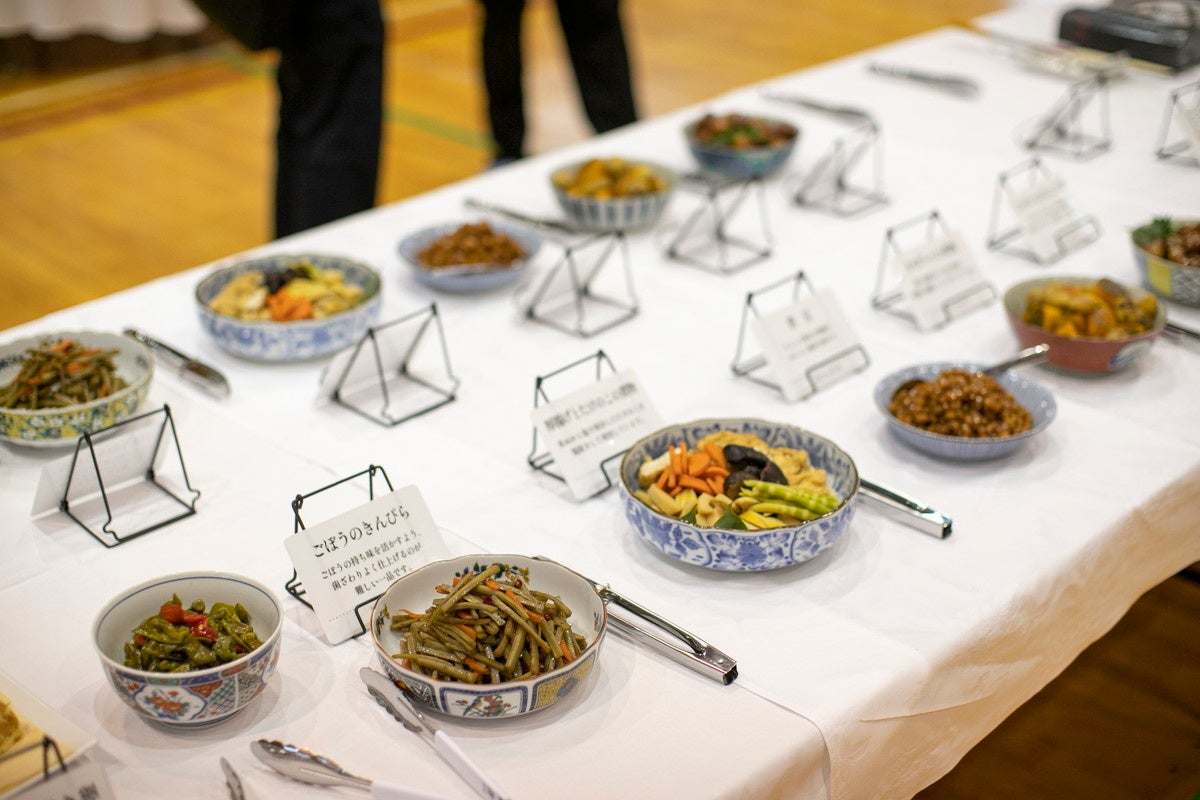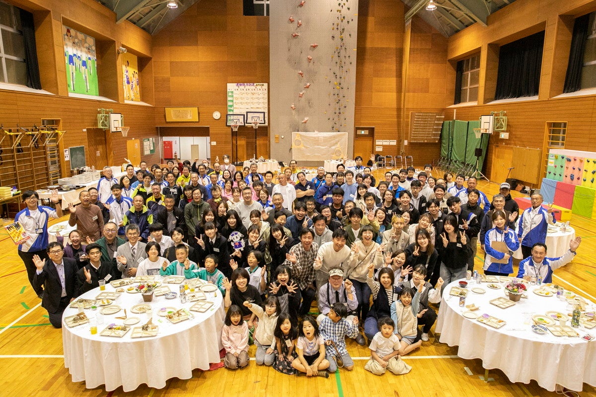 昨年も好評だった交流レセプションを、廃校になった小学校をリノベーションした「農村de合宿キャンプセンター」の体育館にて開催しました。池田町ならではの風土料理を中心とした「池田・食のバイキング」に約20種類のメニューを用意。昨年を上回る130名が参加し、美味しい池田町ならではの地元料理を堪能しながら、選手と池田町民、また選手同士も会話を楽しみ、会場は時間いっぱいまで笑顔の交流にあふれていました。