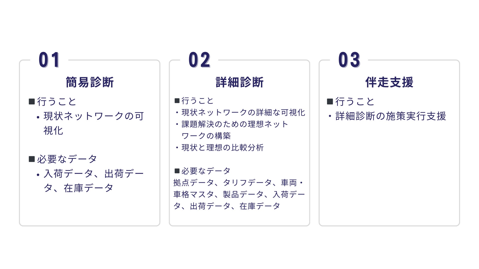 両社による提供サービスは3つから構成されており、物流の「簡易診断」「詳細診断」「伴走コンサルティング」となっております。物流ネットワーク全体の簡易診断、詳細診断を通して荷主企業の課題を明確にしたり、戦略・計画の実現性が正しいかの検証を行います。伴走支援フェーズでは西濃運輸グループの実行ノウハウを活用して物流ネットワークの再編実行支援を行います。