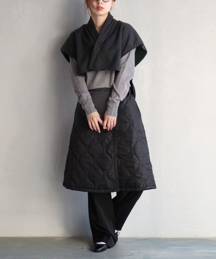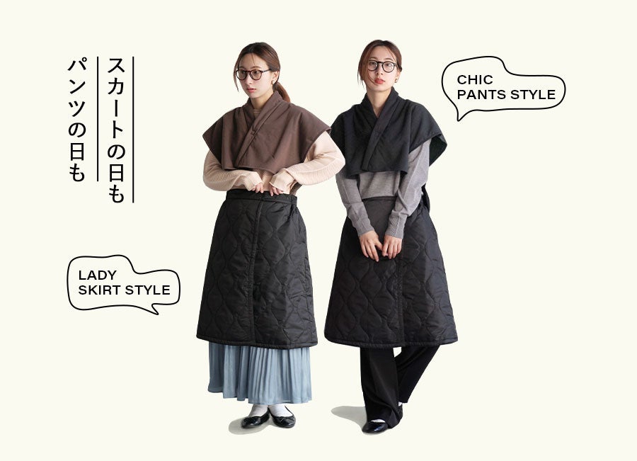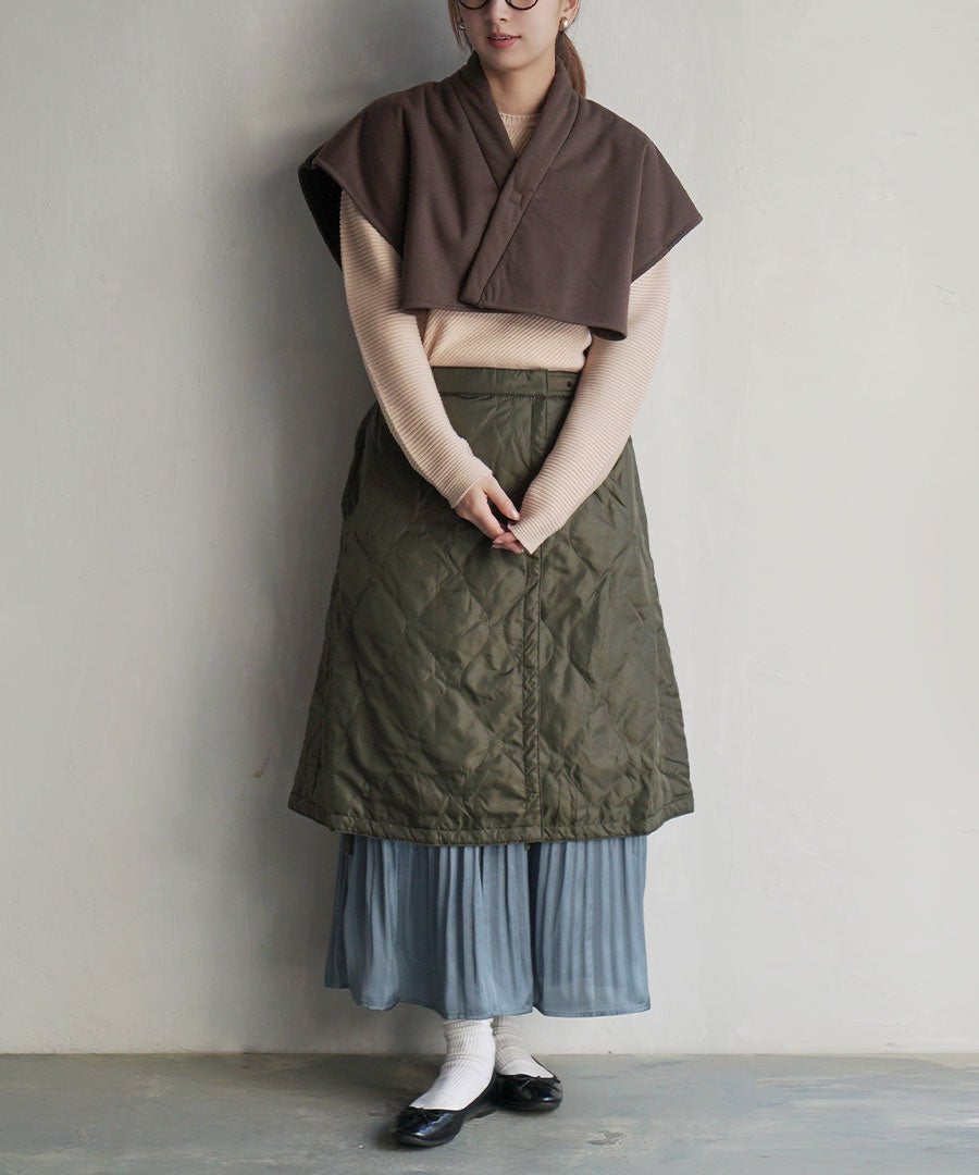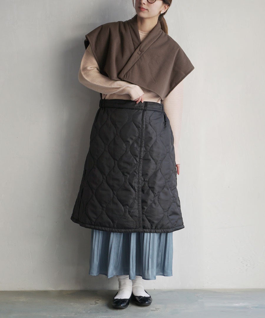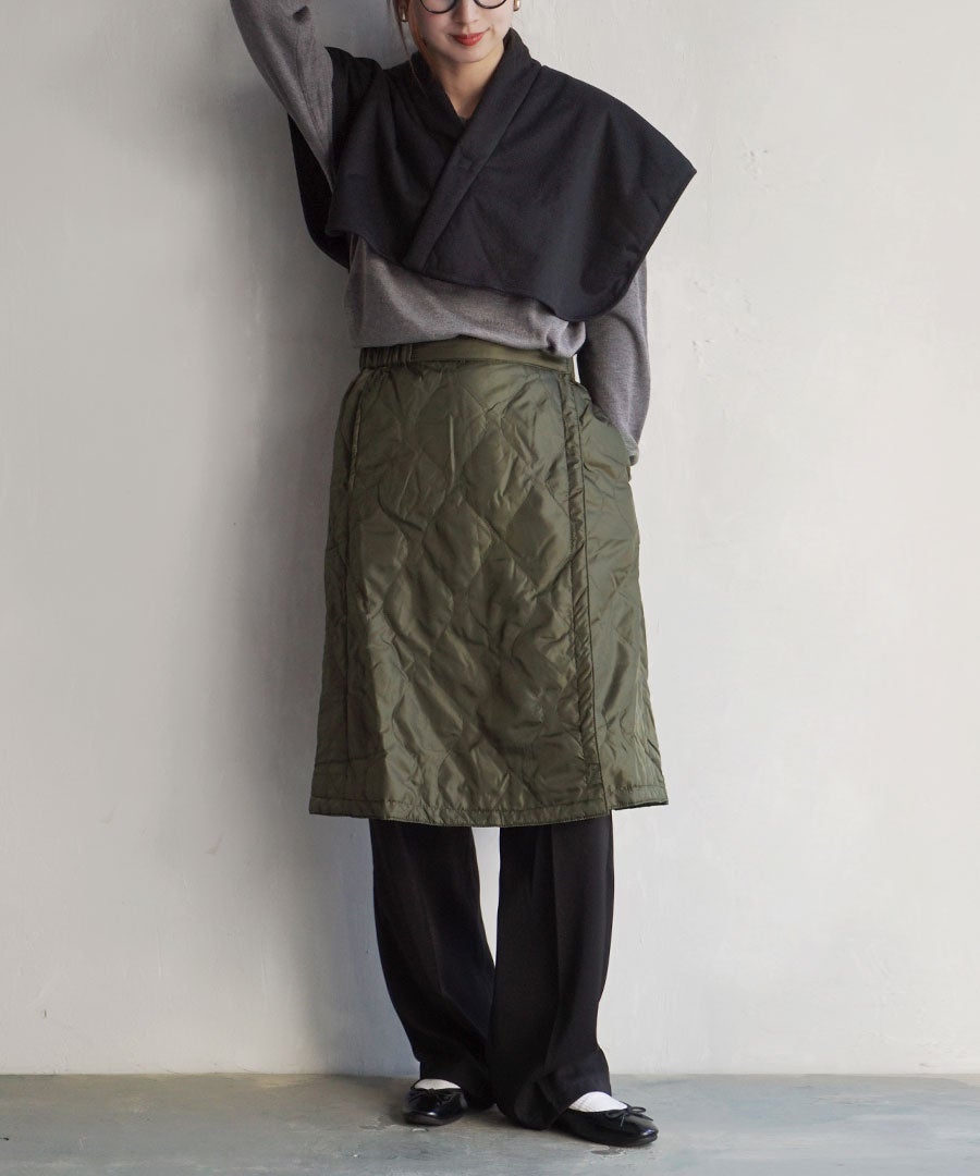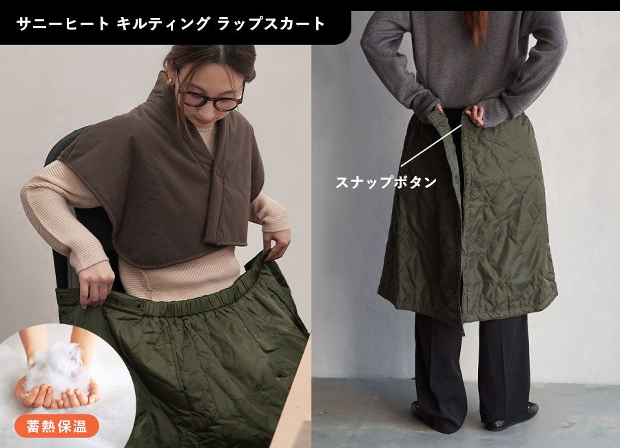 もともと屋外での使用を想定して企画した遠赤外線効果をプラスした中綿を使用したキルティングラップスカートは、実は膝掛けとして超優秀で、オフィスでストールやブランケットをひざ掛けとして使用しているすべてのワーカーにおすすめしたいアイテムです。