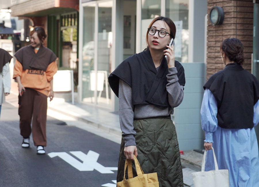 カーディガンなどの羽織だと、その日のコーディネートにあっていないとちょっと気になってしまいますが、「ござるスタイル」は『防寒グッズ』なので、そもそもおしゃれかどうかは考えなくてOK。