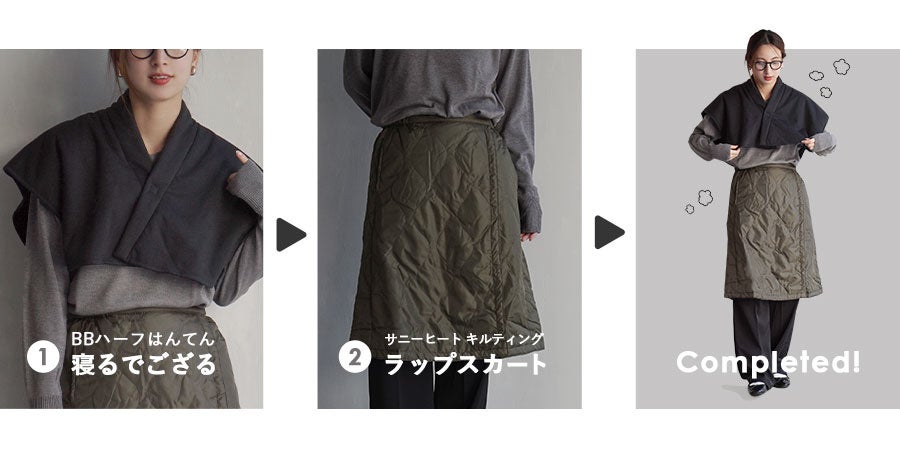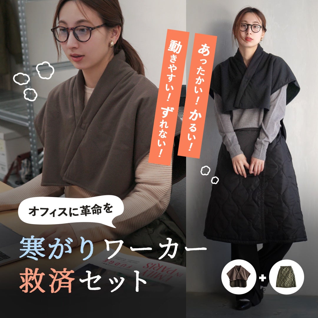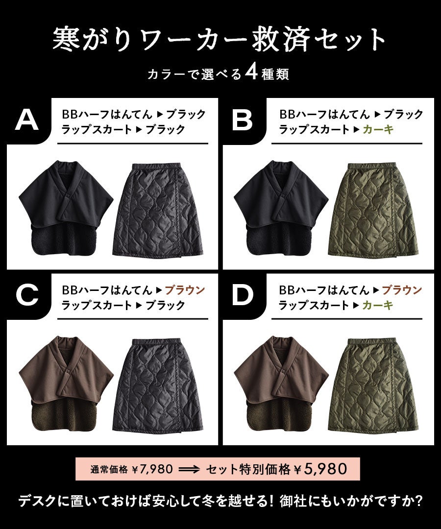 「BB(防風ボア)ハーフはんてん寝るでござる」と「蓄熱フェイクダウン サニーヒートキルティングスカート」をセットにした寒がりワーカー救済セットは、通常価格よりもお求めやすいセット価格での販売です。