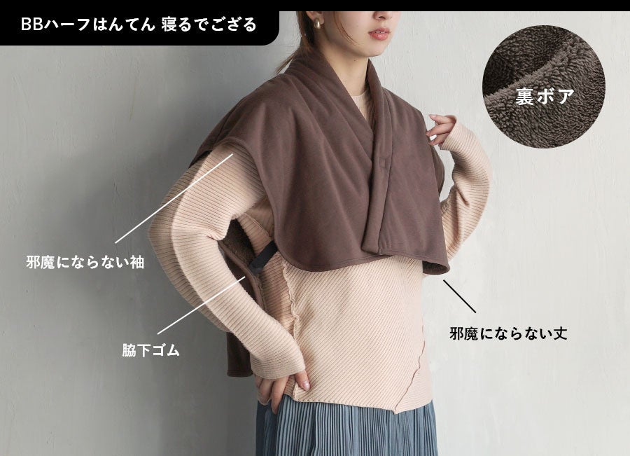 特殊な防風シートを挟んだ三層構造の素材で、自身の体の熱を外に逃しにくい激暖素材を使用した「BB(防風ボア)ハーフはんてん 寝るでござる」(以下ござる)は、本来は、寝ている間に布団からはみ出しがちな肩まわりをすっぽり包んで暖かくという目的で企画された商品です。