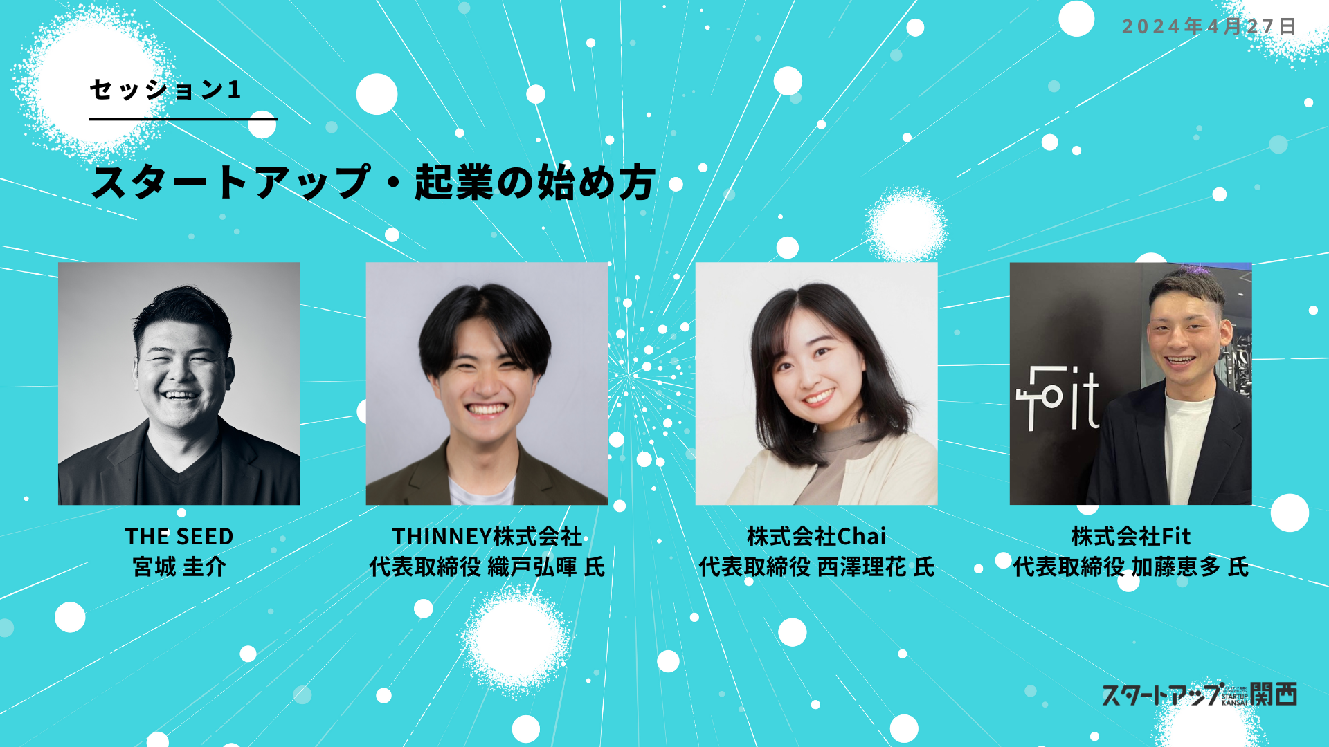 グローバルな環境で育ち、日本で起業を決意したChai 西澤氏、近畿大学在学中に起業し、実体験を基に金融教育事業へ挑戦するTHINNEY 織戸氏、京都大学在学中に学生起業し、6億円の資金調達を実施したFiT 加藤氏など、様々なキャリアを経て起業した3名に、それぞれの自身の経験を通じて、起業の動機や背景に迫ります。銀行や事業会社を経て、昨年4月よりキャピタリストとして活動する宮城がモデレーターとして、投資の観点から学生向けにアドバイスを提供しつつ、スタートアップの成長と資金調達についてお伝えします。
