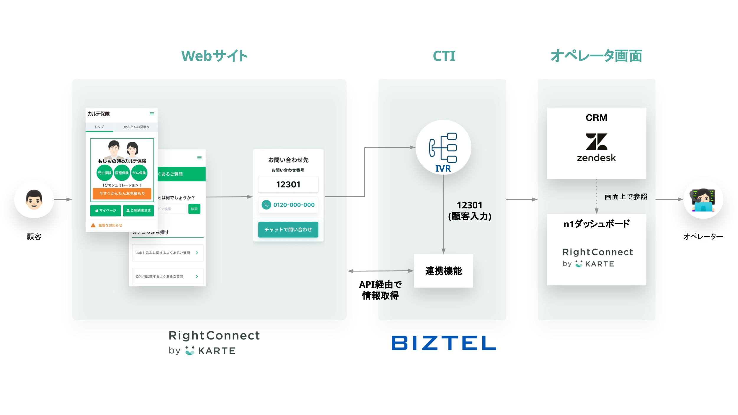 顧客が電話問い合わせをすると、BIZTELのIVR(※1)につながる。その際、顧客に「問い合わせ番号」を入力してもらうことで、適切な応対窓口への電話振り分けや、問い合わせ前の行動等の顧客データをZendeskに連携表示する起点となる動作をおこなう。
