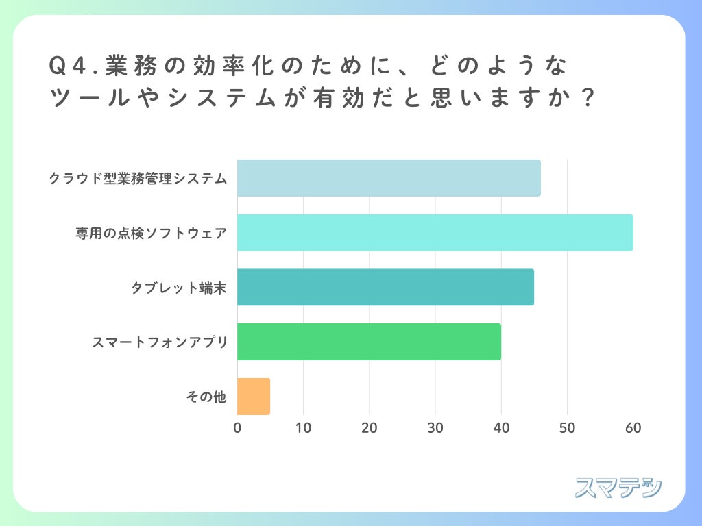 最も多いのは「点検作業(機器操作、記録など)」だが、次いで「報告書作成」、「事前準備(書類作成、日程調整など)」が上位に。 点検作業そのものだけでなく、それに付帯する事務作業、特に「報告書作成」に多くの時間や手間が割かれている実態が明らかになりました。Q2で挙がった「業務効率の悪さ」の具体的な要因の一つと考えられ、ペーパーレス化や報告書作成支援ツールのニーズを示唆しています。