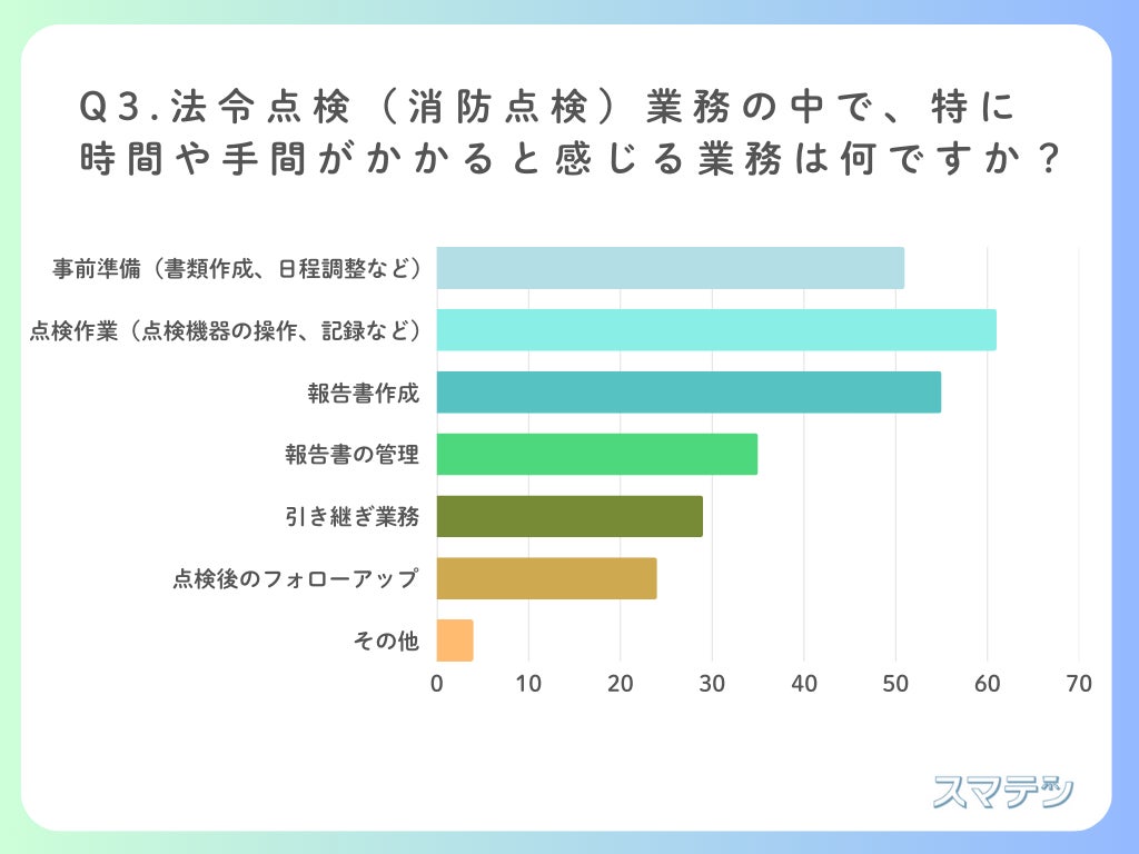 Q3. 法令点検(消防点検)業務の中で、特に時間や手間がかかると感じる業務は何ですか?(複数回答)
