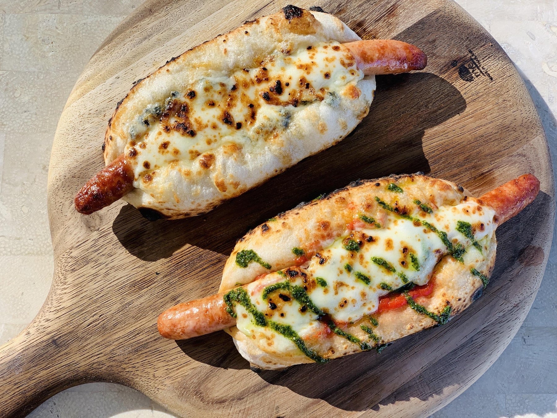 ピッツェリア発、新食感ドッグ!!こだわりのピザ生地に旨味たっぷりのロングソーセージをのせ、540度の石窯で一気に焼き上げる、唯一無二の当店オリジナルドッグ。新鮮はフレーバーと濃厚なチーズ、ピザ生地ならではのモッチリ食感とジューシーなソーセージのコラボレーションはきっと記憶に焼き付く味。ガブリとお楽しみください!