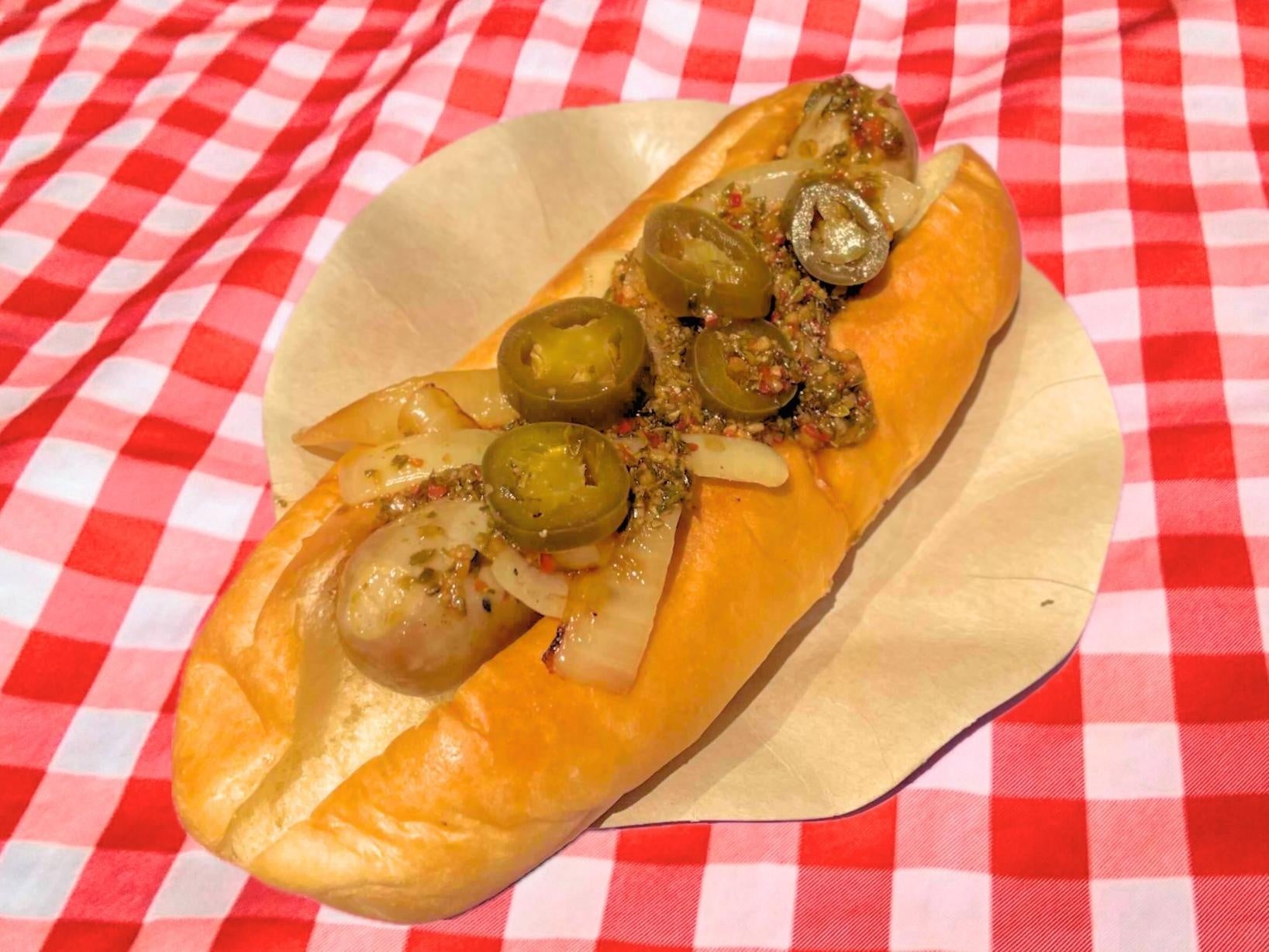ジャンボソーセージの肉汁と自家製チミチュリソースの相性ピッタリ!是非食べたことのない方にお勧めしています。ハラペーニョのピリ辛はマストです!絶対にハマる酸っぱ辛いソース、ぜひご堪能ください!