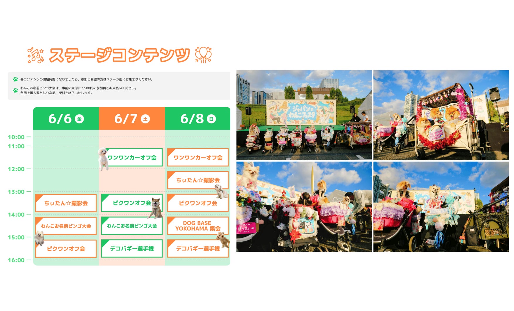 わんこエリアの今年のステージコンテンツでは、昨年も大好評だったデコバギー選手権をはじめ、新たに楽しめる企画を多数用意しました!しかも今年はスペシャルゲストとの撮影会も・・!「ビンゴ」の数字が全部わんちゃんの名前になる「わんこお名前ビンゴ大会」や、愛犬がまるで「ピク●ン」!?イベント公式オリジナルグッズ「わんちゃん用コームピン」の購入者限定で参加できる「ピクワンオフ会」にも注目です!DOG BASE YOKOHAMA 集会によるファッションショーや撮影会もあるのでお楽しみに!参加方法は時間になったらステージ前に集合するだけでOK!事前のお申込みは不要で参加費も無料!昨年よりも数段パワーアップしたステージコンテンツを、愛犬と一緒にぜひお楽しみください!