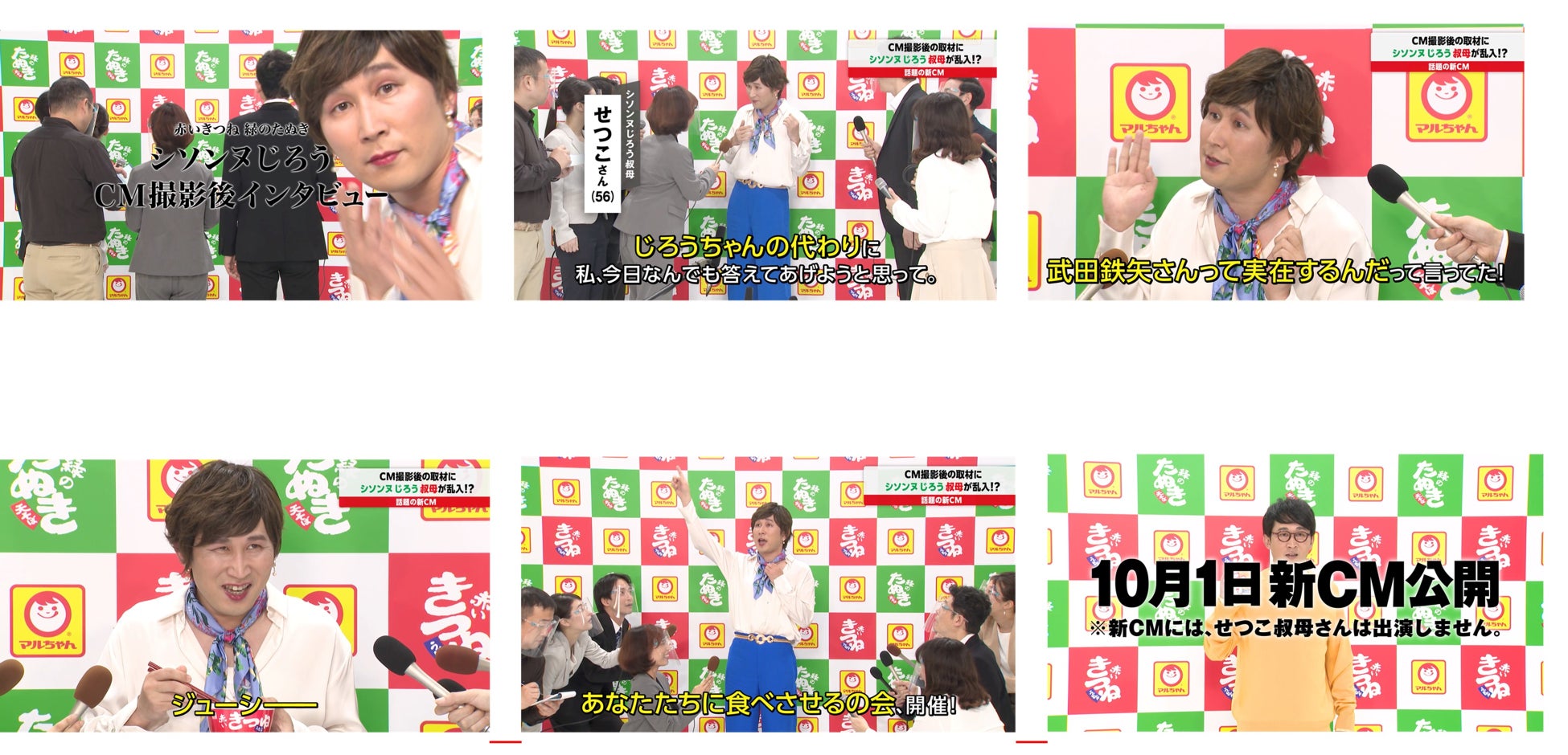 この度公開した特別WEBムービーは、マルちゃん「赤いきつね緑のたぬき」のCM撮影後インタビューに、シソンヌじろうさんの代わりにまさかの叔母のせつこさんが登場する、記者会見動画となっています。せつこさんの親しみやすい人柄から、続々と質問をする記者へ、笑いを交えながらインタビューに答えていくストーリーです。その中でもせつこさんが披露する「赤いきつねと緑のたぬき~♪」でおなじみのメロディーに合わせた替え歌や、東洋水産のキャラクター”マルちゃん”の顔マネは特に見どころとなっています。多種多様なキャラクターを自在に演じ分ける、シソンヌじろうさんが出演する前代未聞の記者会見動画を是非ご覧ください。