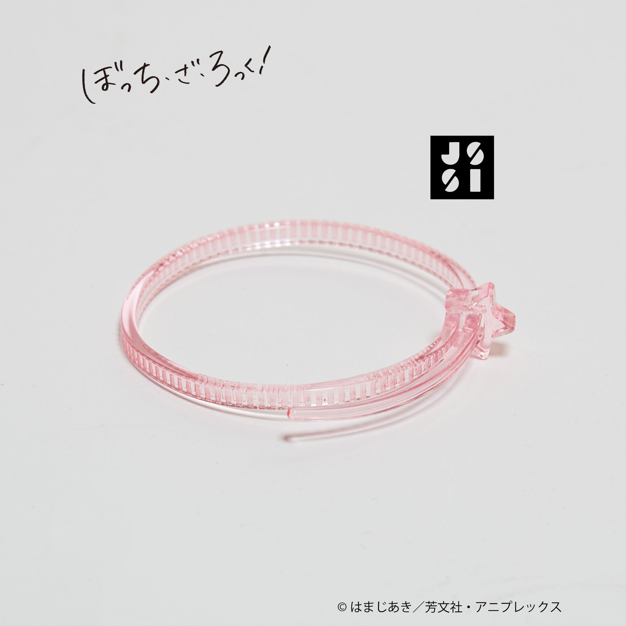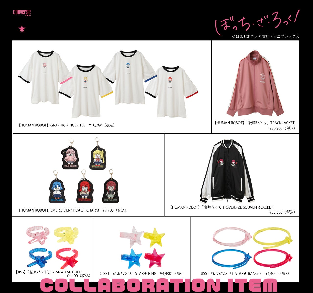 さらに、主人公・後藤ひとりが作中で着ていたジャージを、CONVERSE TOKYOの定番アイテムであるトラックジャケットで再現し、お酒好きの天才ベーシスト・廣井きくりが愛用するスカジャンもアイテム化。アクセサリーブランド・JISSからは、本コラボレーションのために別注で制作した“結束バンド”カラーで仕上げた結束バンド型のアクセサリーも登場。イヤカフ、バングル、リングの3種を展開し、メンバーのカラーをいつでも身にまとえます。
