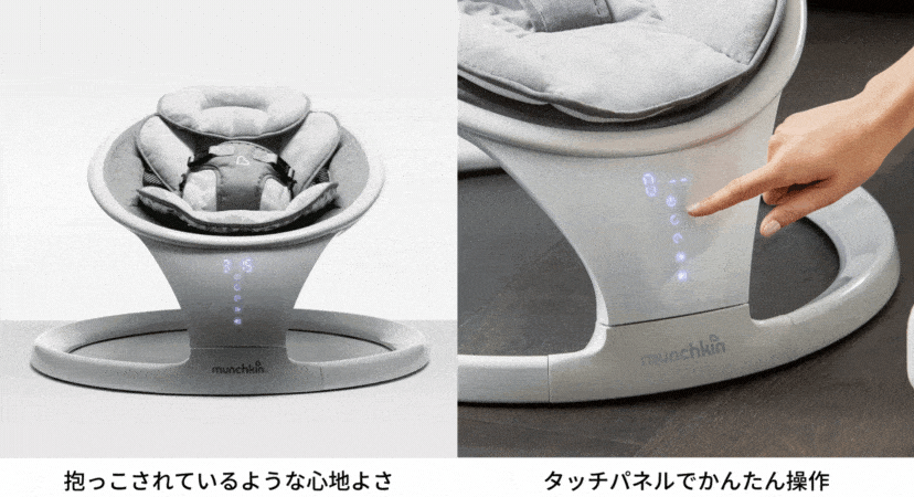 スウィング機能をはじめ、リモコン操作やBluetooth®機能搭載でお好みの音楽が流せる等、充実した機能でありながら、タッチパネルで直観的に使いこなせるシンプル設計。電動とは思えないスッキリとしたデザインと軽さで移動も楽々。家事の間も赤ちゃんのすぐそばで安心して育児ができます。