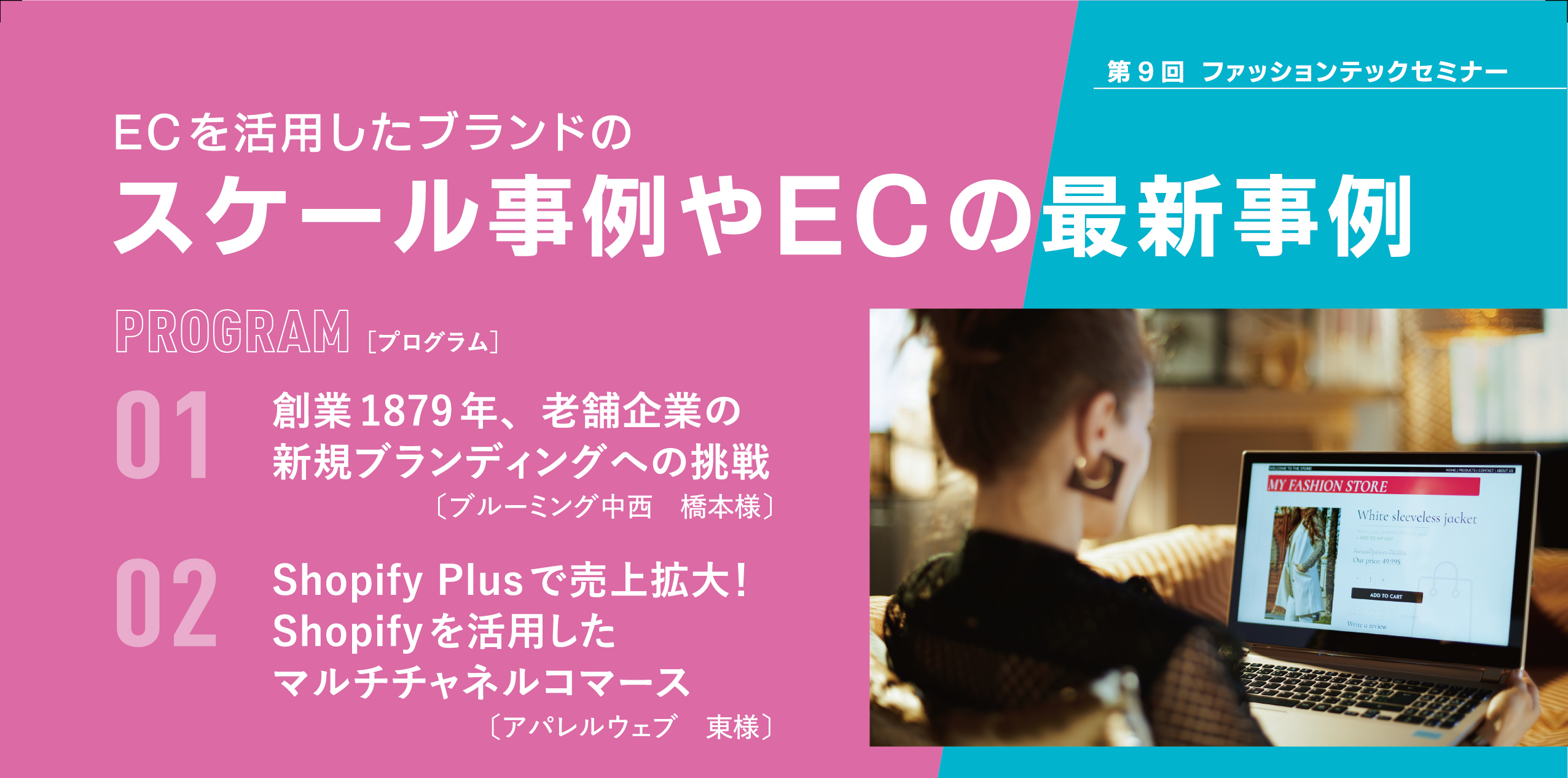 第9 回は世界シェアNo.1 のEC プラットフォームを展開するShopifyを活用して、新規ブランディングを行う老舗メーカーのブルーミング中西(株)の橋本氏に、事業者目線での活用実例をお話いただきます。また、Shopify の外部パートナーである(株)アパレルウェブの東氏には、ECサイトによるグローバル戦略やECサイト運営の成功についてご登壇いただきます。