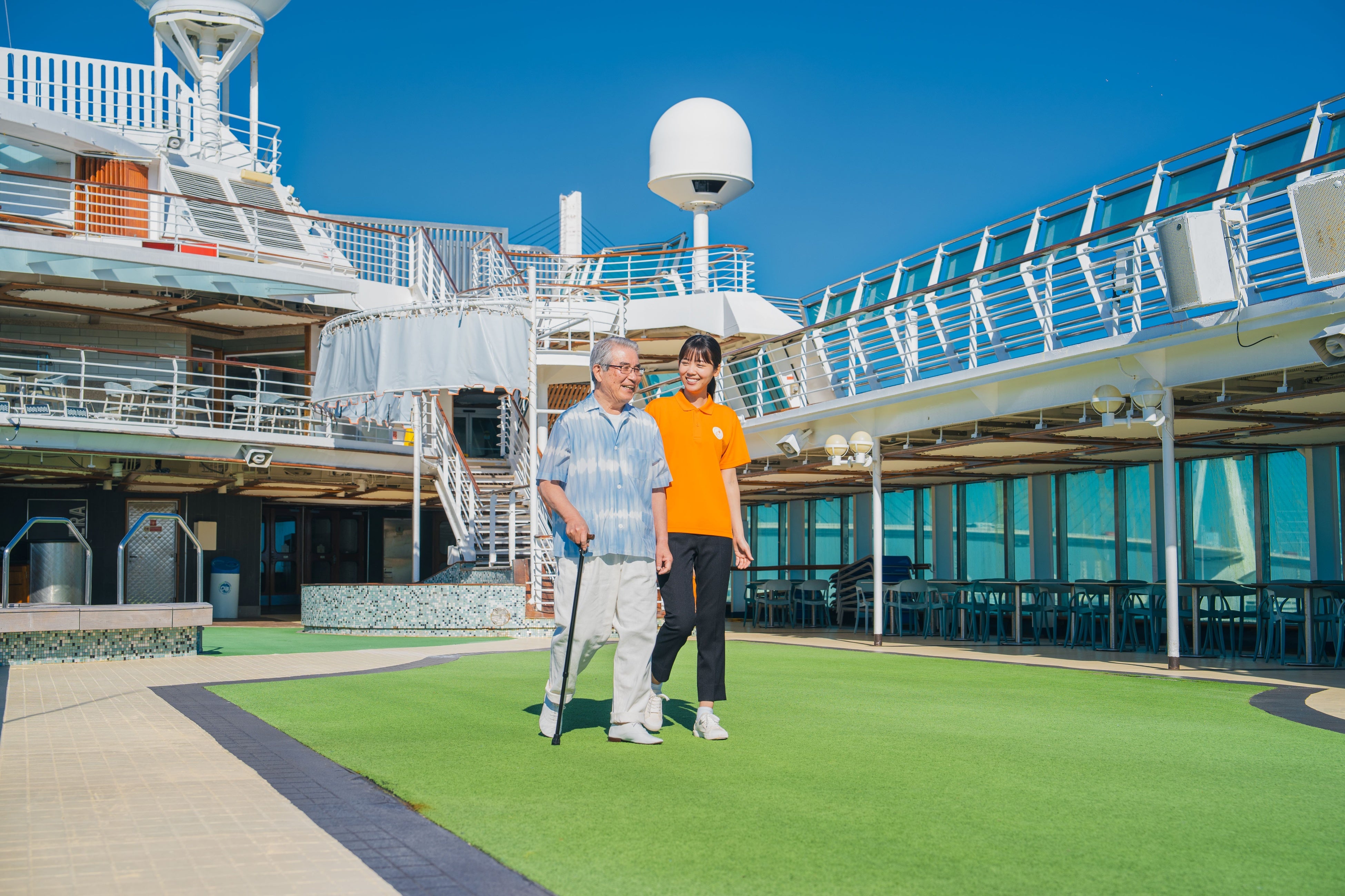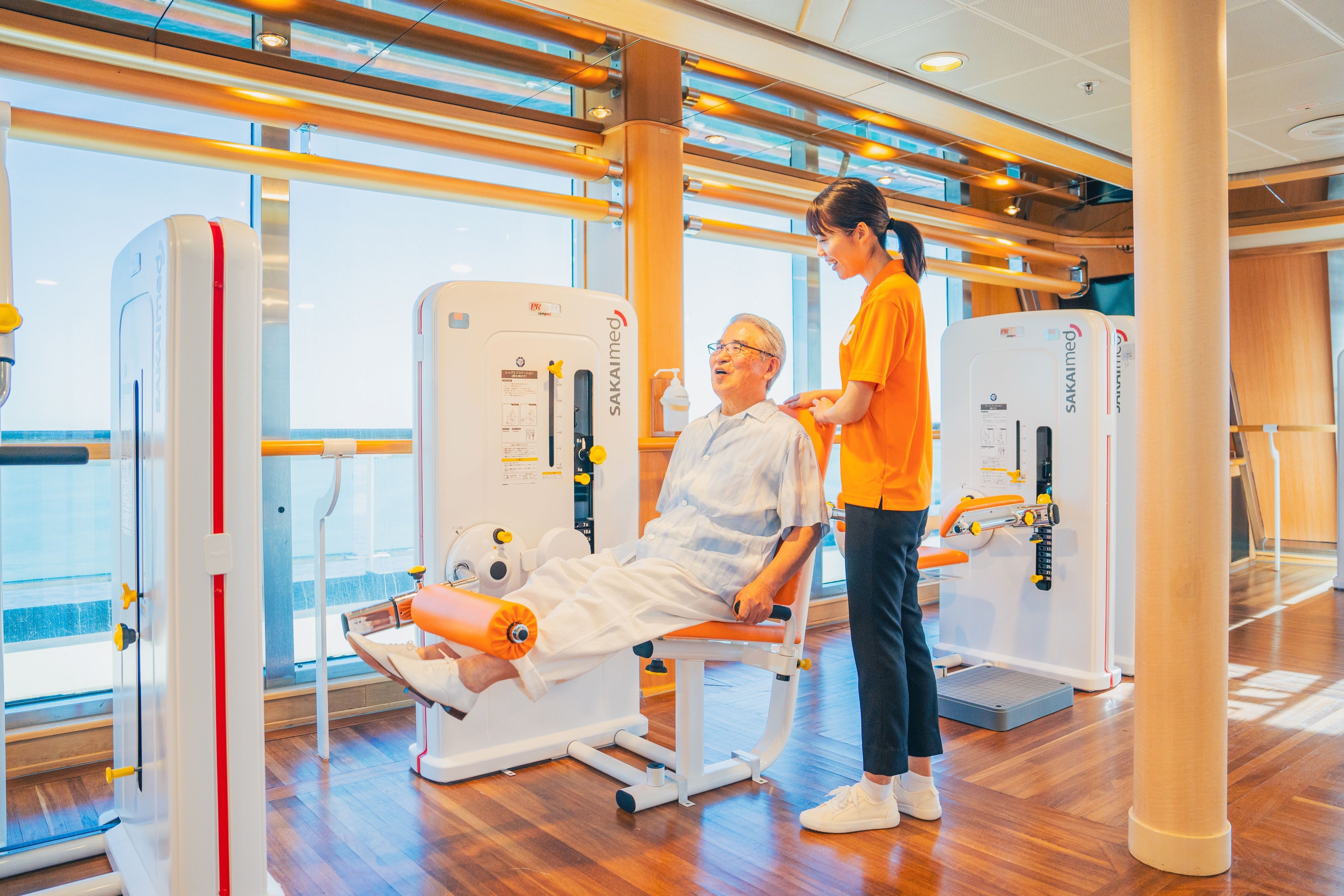 「高齢になっても夢をあきらめない」「自分の足で世界を巡りたい」という想いをポラリスでサポートします。専用のリハビリマシン、歩行能力をアップさせるポラリス独自Pウォークマシンを整え、経験豊富なエキスパートにより自分に合わせたプログラムを設定します。海の上の特別な空間で効果的なリハビリをしながら、新しい世界が目に入り、世代や文化の垣根を越えた出会いと交流できます。