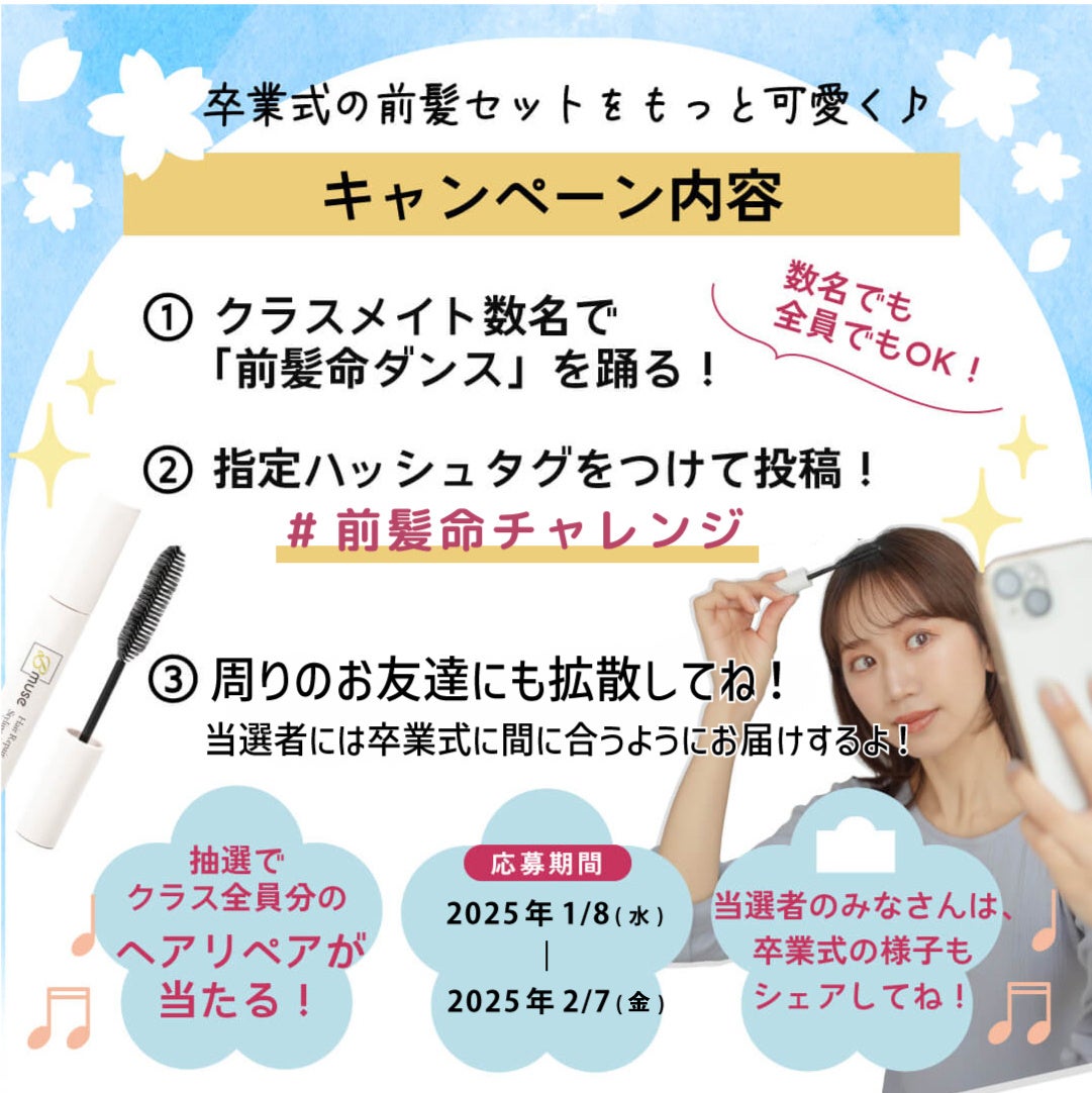 「#前髪命キャンペーン」 高校生限定!卒業式をクラスみんなで輝かせよう! キレイデラボ(株式会社ウエルネス・ラボ)は、2025年1月8日(水)から2025年2月7日 (金)まで、全国の高校生を対象にした特別なキャンペーンを開催!オリジナルダンスを踊るだけで応募完了!当選した高校生のクラス全員には、卒業式をもっと華やかにするための「ヘアリペアポイントスティック」をプレゼント!みんなで楽しみながら、卒業式をより素敵な思い出にしませんか? 新しいチャレンジ型キャンペーン、今すぐ参加しよう。