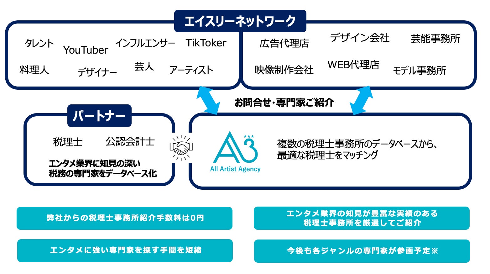 専門家マッチング支援サービス「タスケル税務」とは、各種専門家の方のアドバイスや役務提供を受けたいタレントやエンタメ企業を対象に、エイスリー独自の審査基準で厳選された士業(税理士、公認会計士)の皆様をお繋ぎするサービスです。