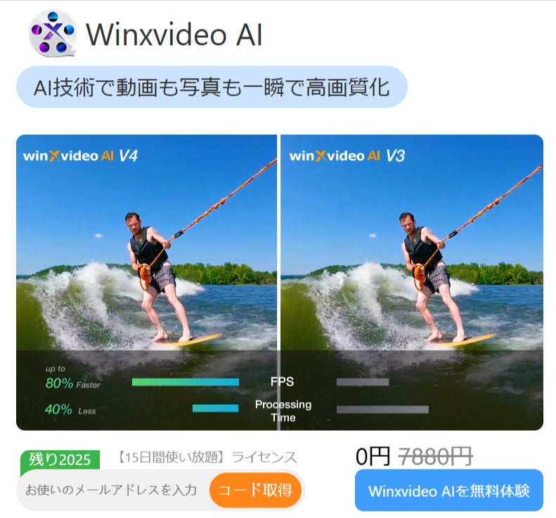 毎日先着順で2026名様にお届けします。ページにメールアドレスを入力すればWinxvideo AIライセンスコードを無料にもらえます。