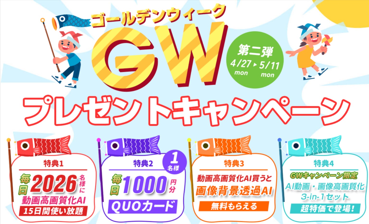 【無料コード配布中】Aiarty Video Enhancerライセンスコード毎日2026名様に無料配布!QUOカード毎日1000円分抽選!2026 GW特典開催
