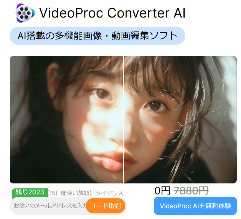 毎日先着順で2026名様にお届けします。ページにメールアドレスを入力すればVideoProc Converter AIライセンスコードを無料にもらえます。