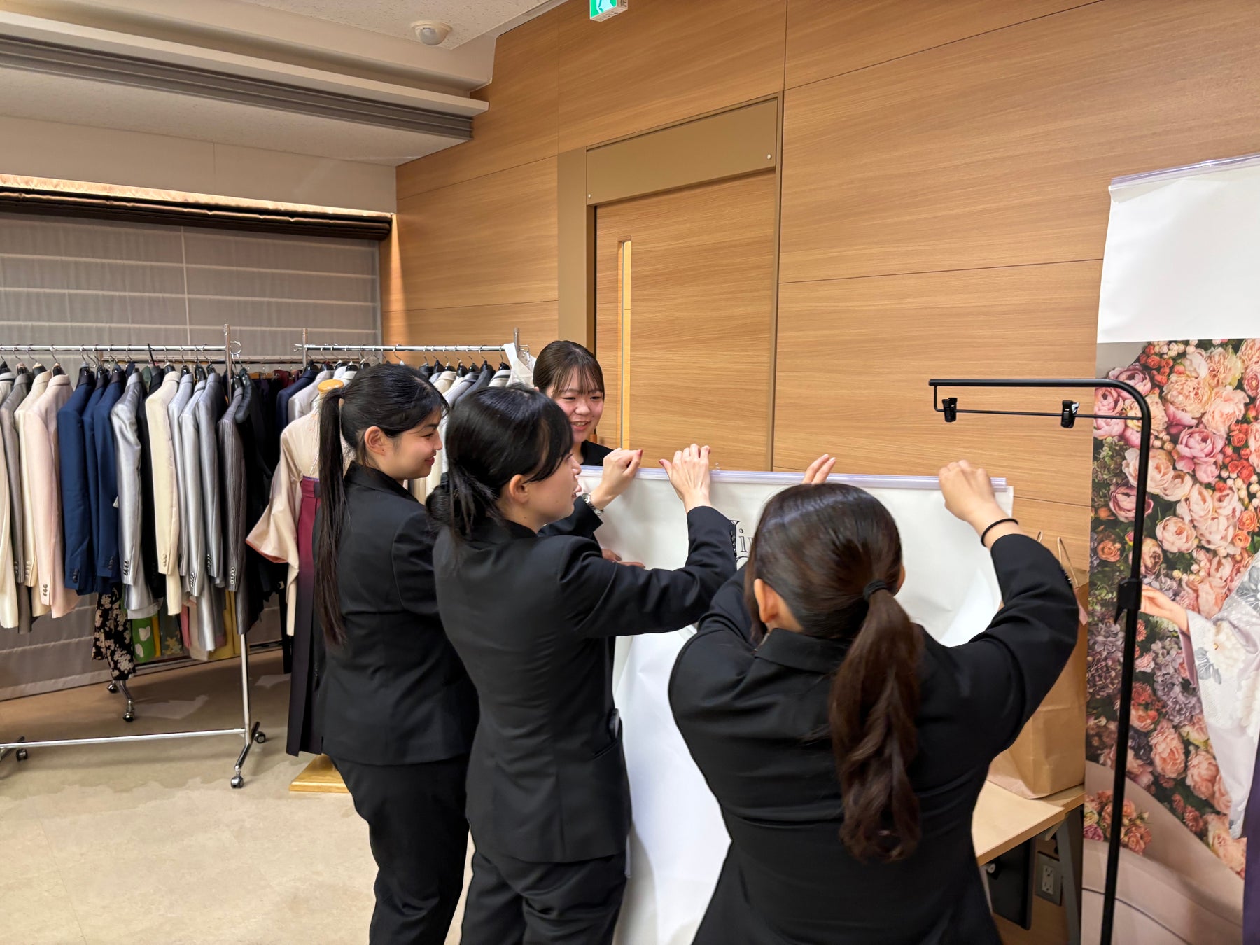 本プログラムは、卒業式で着用する袴やタキシードを対象に、学生が企画から集客、接客、売上管理までを担当する点が特徴です。扱う商材こそ袴ですが、実施内容はまさにドレスショップ運営そのものであり、ブライダル分野で求められる現場力の習得を目的としています。開催に先立ち、協力企業より商品知識や接客手法、心構えに関する講義を受け、学生たちは着付け練習・接客練習・売上計画の立案など入念な準備を重ねました。当日は現役スタッフの卒業生も来校し、仕事の楽しさや現場でのリアルな経験談に触れることで、学生にとって大きな刺激となりました。展示会期間中は、学生が来場者のニーズに合わせた提案や接客を行い、チームごとの運営を通して仲間と協力する重要性やマネジメント力を学びました。