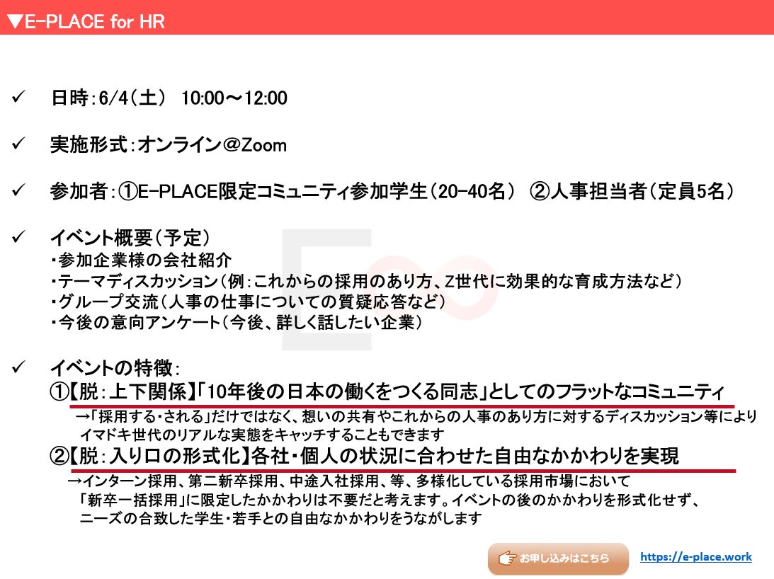 『E-Place』とは、ファーストキャリアから人事としての活躍を志す「学生」と、企業で活躍する「人事担当者」が共に学び、フラットに繋がる、学習コミュニティです。