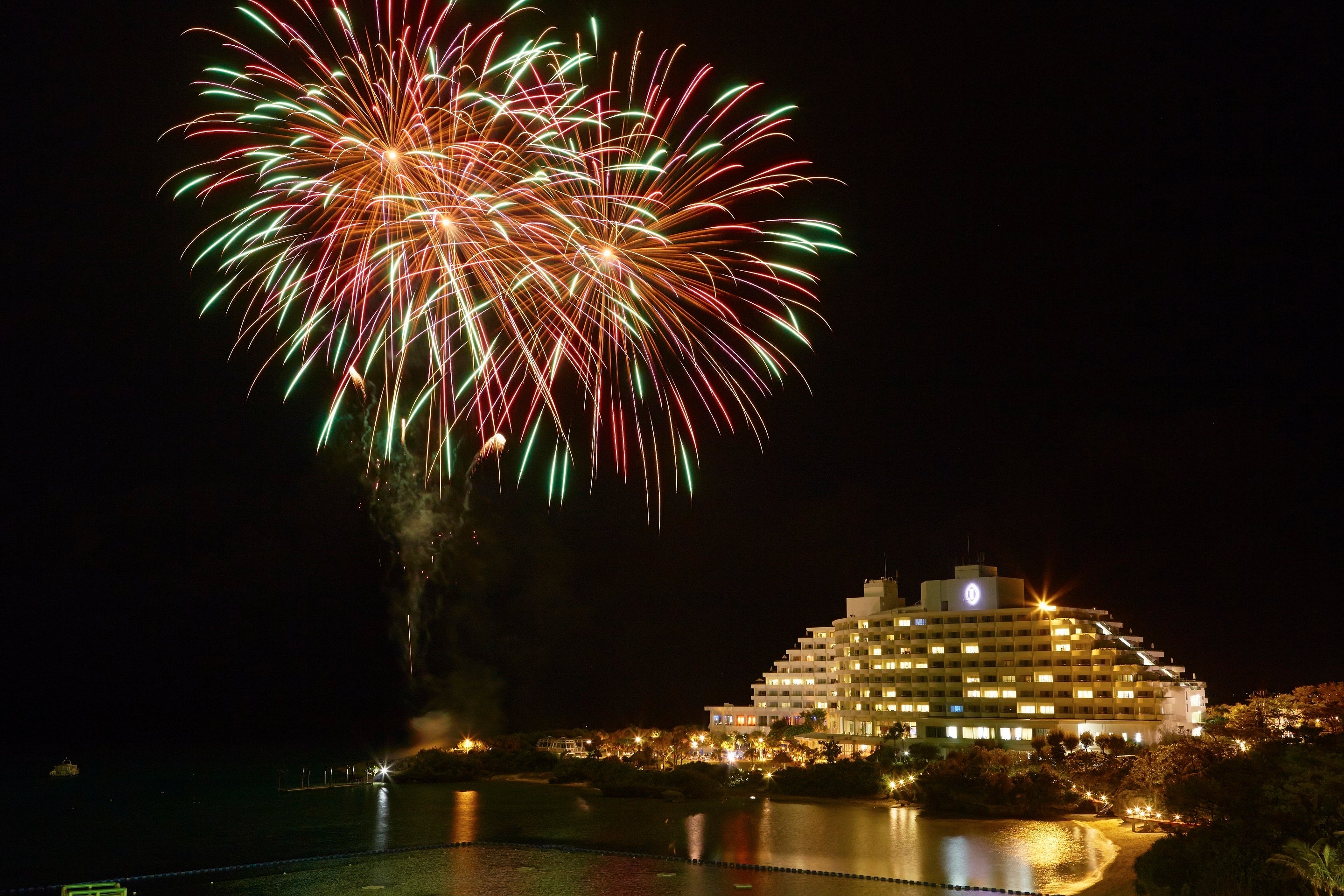 万座の夜空を彩る花火を、カタマランヨットの船上から見上げてお祝いを。