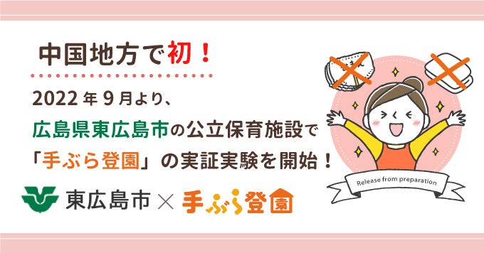 BABY JOB株式会社(本社:大阪府大阪市、以下当社)は、広島県東広島市の公立保育施設において、当社とユニ・チャーム株式会社が提供する、保育施設向け紙おむつの定額サービス「手ぶら登園」の実証実験を、2022年9月より2か月間実施することをお知らせします。中国地方では、初の取り組みになります。