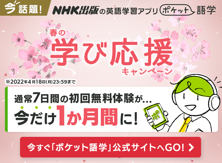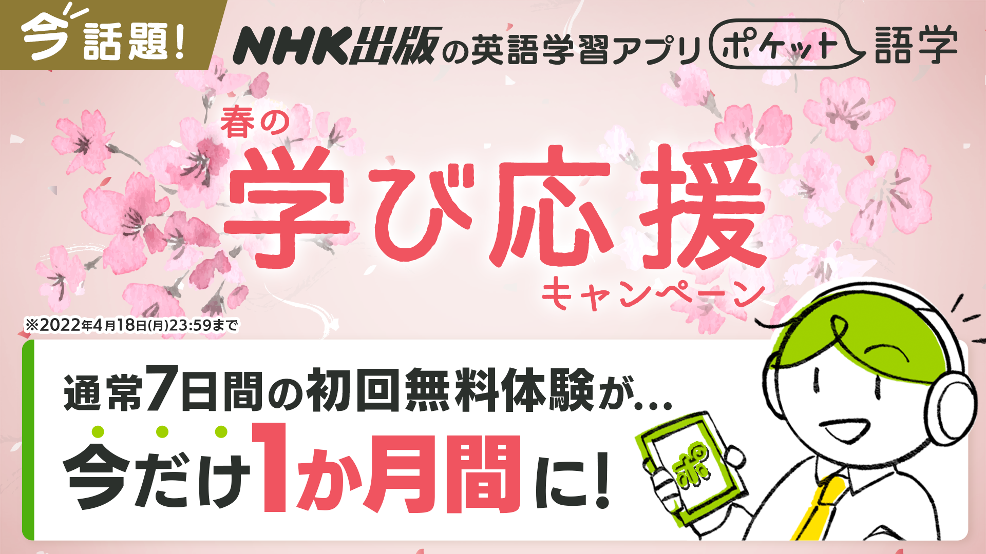 NHK英語講座の内容がスマホで学べる「ポケット語学」では、通常7日間の初回無料体験期間が1か月に延びる「春の学び応援キャンペーン」を開催します。申し込み期間は2022年4月18日までです。