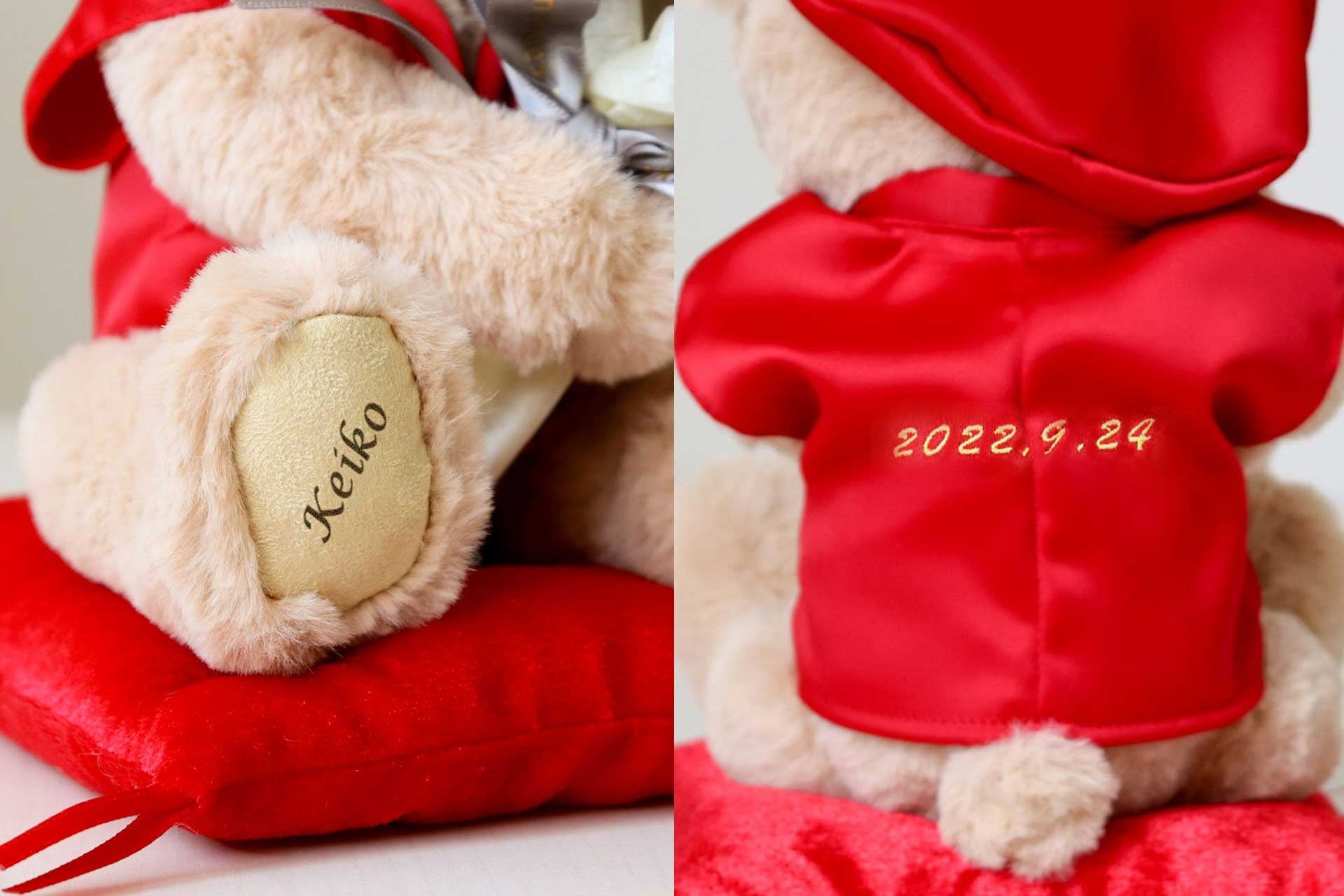 テディベアの足裏にお名前やメッセージをプリントしたり、ちゃんちゃんこの背中に日付を刺繍する、別オプションも承ります。さらに特別感をお求めの方に最適です。