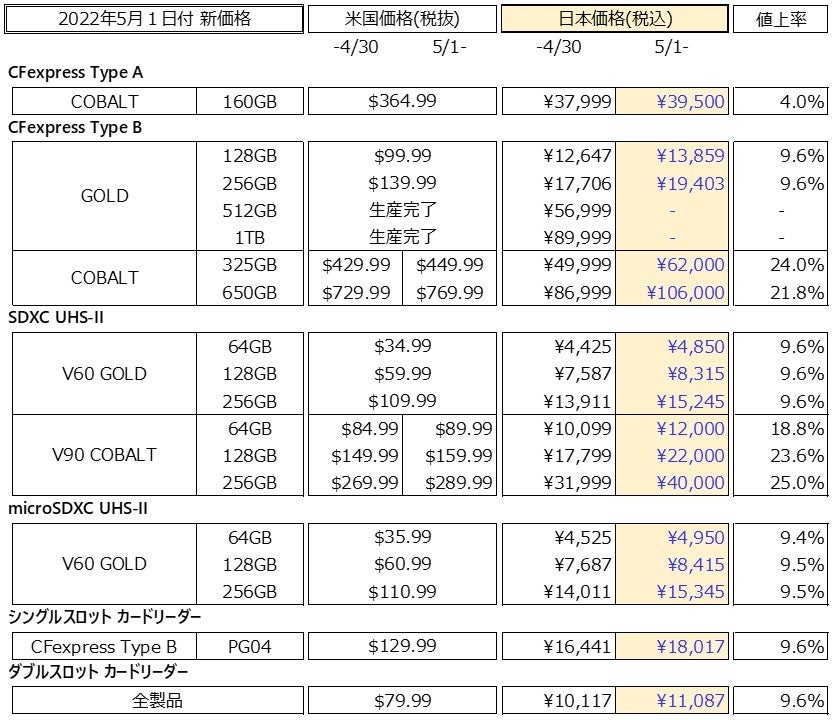 ~CFexpress COBALTおよびSDXC COBALTは、19%-25%の値上げ~