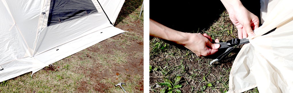 フライシートのスカートには、8か所のテンションベルトが付いており、フライシートの弛み、しわがなく張ることができます。