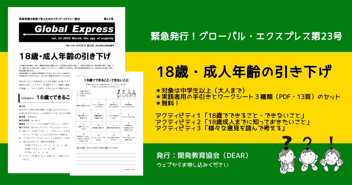 認定NPO法人開発教育協会(東京都文京区、代表理事・湯本浩之)は、ワークショップ教材『18歳・成人年齢の引き下げ』を発行しました。ウェブサイトから無料で申込・ダウンロードしてご利用いただけます。
