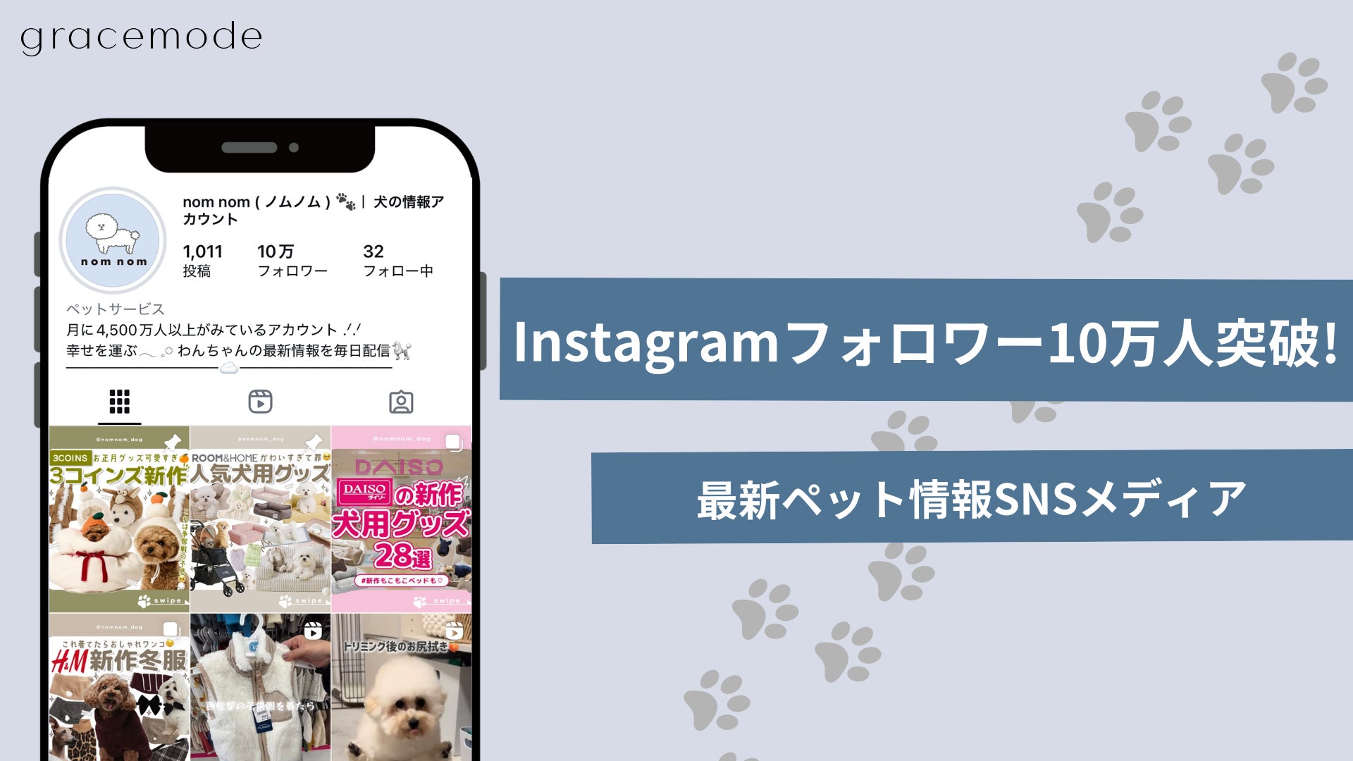 株式会社gracemode(本社:東京都目黒区、代表取締役:木上実乃里)が運営するペットメディアアカウント「nomnom-ノムノム-」は、2025年11月時点でInstagramのフォロワー数が10万人を突破したことをお知らせいたします。