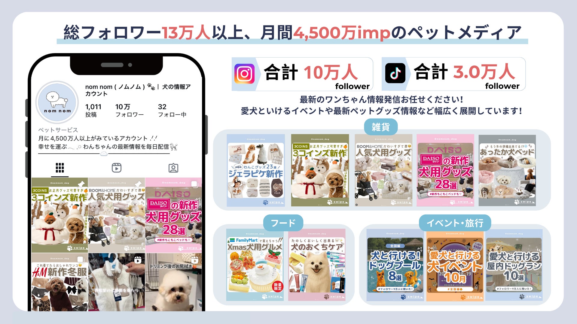 総フォロワー13万人以上を有するペットSNSメディア「nomnom-ノムノム-」は、単独アカウントで月間4,500万IMP(閲覧数)を誇ります。