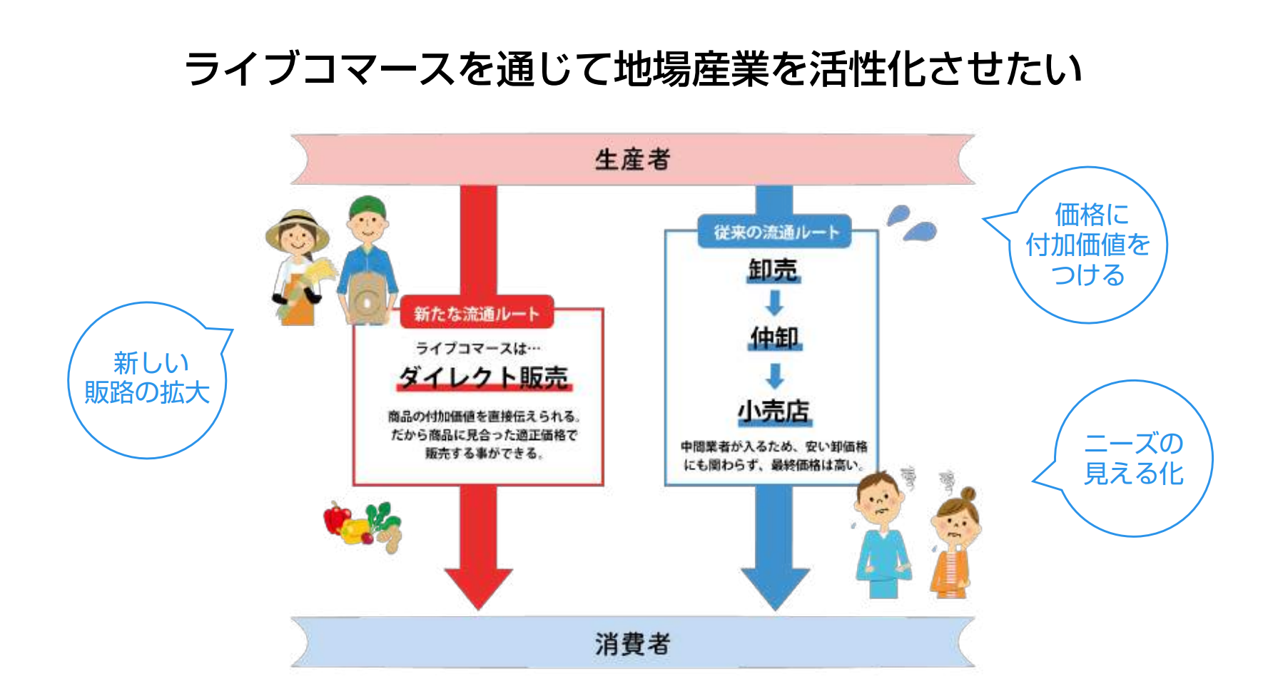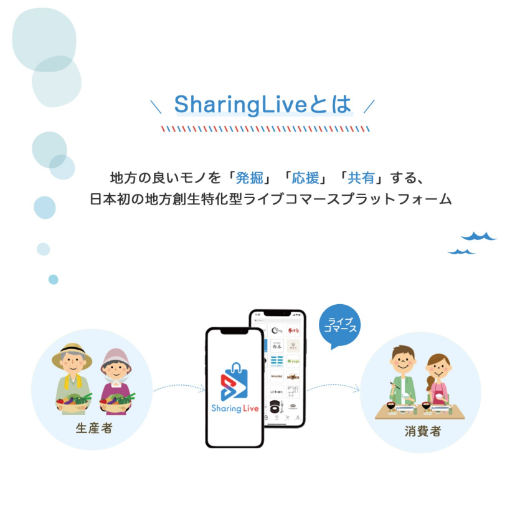 新型コロナウイルスの感染拡大の影響により、マーケティング手法や人々の生活に大きな影響を及ぼしています。新しい価値を世間は模索している中、変わらないのは「繋がり」への追求です。特に地方は持続可能な社会に向けて観光産業の復興などの課題もあり、オンライン「体験」から「応援」、そして「共有」という助け合いの流れを求めています。SharingLiveが実現したいのは、地場産業の先にある「人と人とのつながり」の見える化です。ライブコマースの特徴である双方向だからこそ、生産者との繋がり、共感を生み出すキーになります。