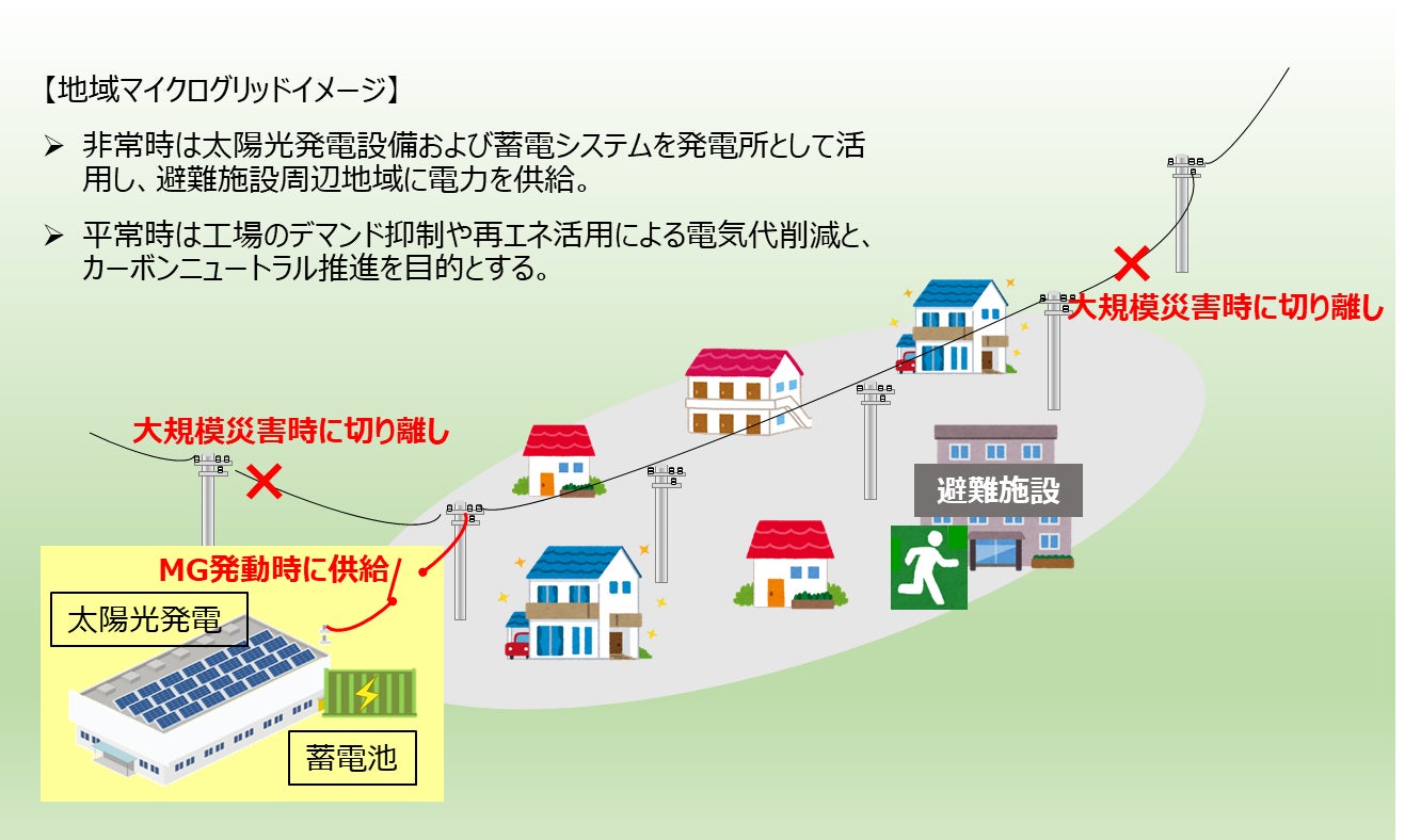 ムサシは創業100周年に当たる2038年までに事業活動(※2)でのカーボンニュートラル実現を目指す「ムサシカーボンニュートラル宣言」を発表しております。本年度は、豊橋市における地域マイクログリッドの構築に向け、経済産業省「令和3年度補正 地域共生型再生可能エネルギー等普及促進事業費補助金(地域マイクログリッド広域支援事業のうち、地域マイクログリッド構築事業)」に採択され、この実現に向け豊橋市、中部電力パワーグリッド株式会社様の助言をいただきながら、運用プロセスと機器検討・導入を進めてまいりました。また、以下のマイクログリッド関連機器事業者様(株式会社トーエネック、株式会社三社電機製作所、岡谷機電株式会社、株式会社駒井ハルテック、日本ガスコム株式会社、武蔵エナジーソリューションズ株式会社)の協力を得ながらマイクログリッドの維持運用を進めてまいります。