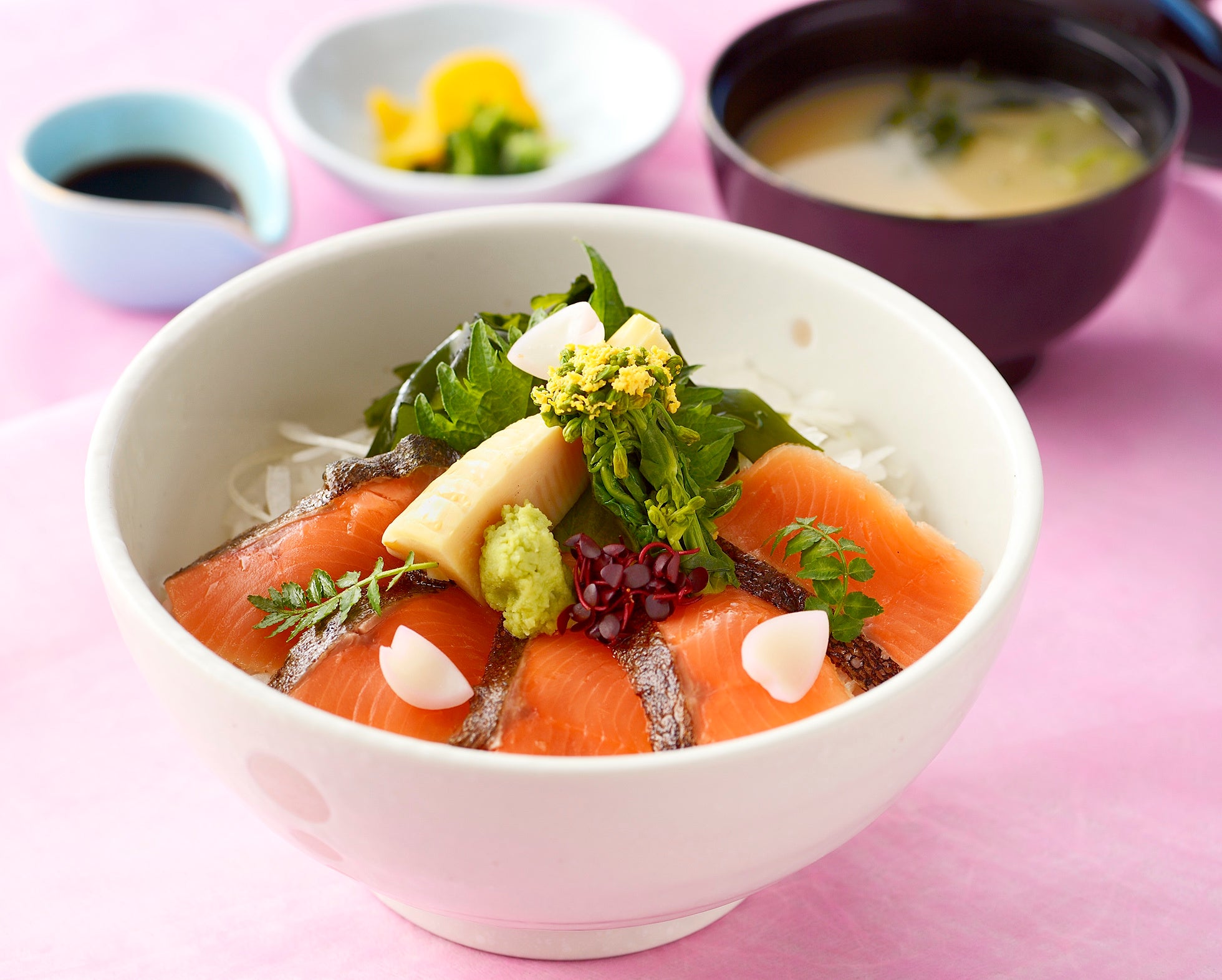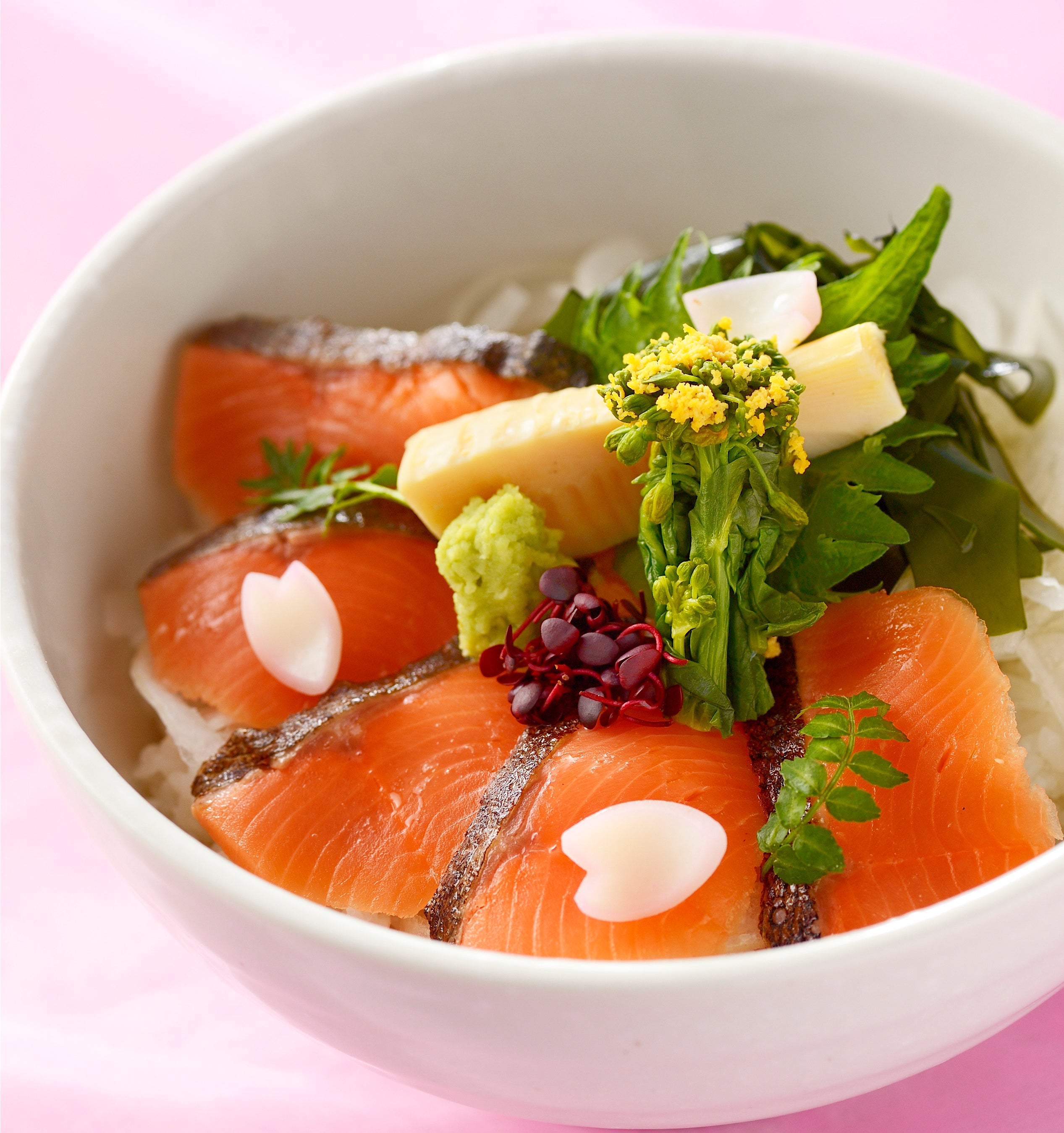 福良湾で育ち、脂がのったサクラマスの皮を炙り、春野菜と共にあっさりとした丼に仕上げました。