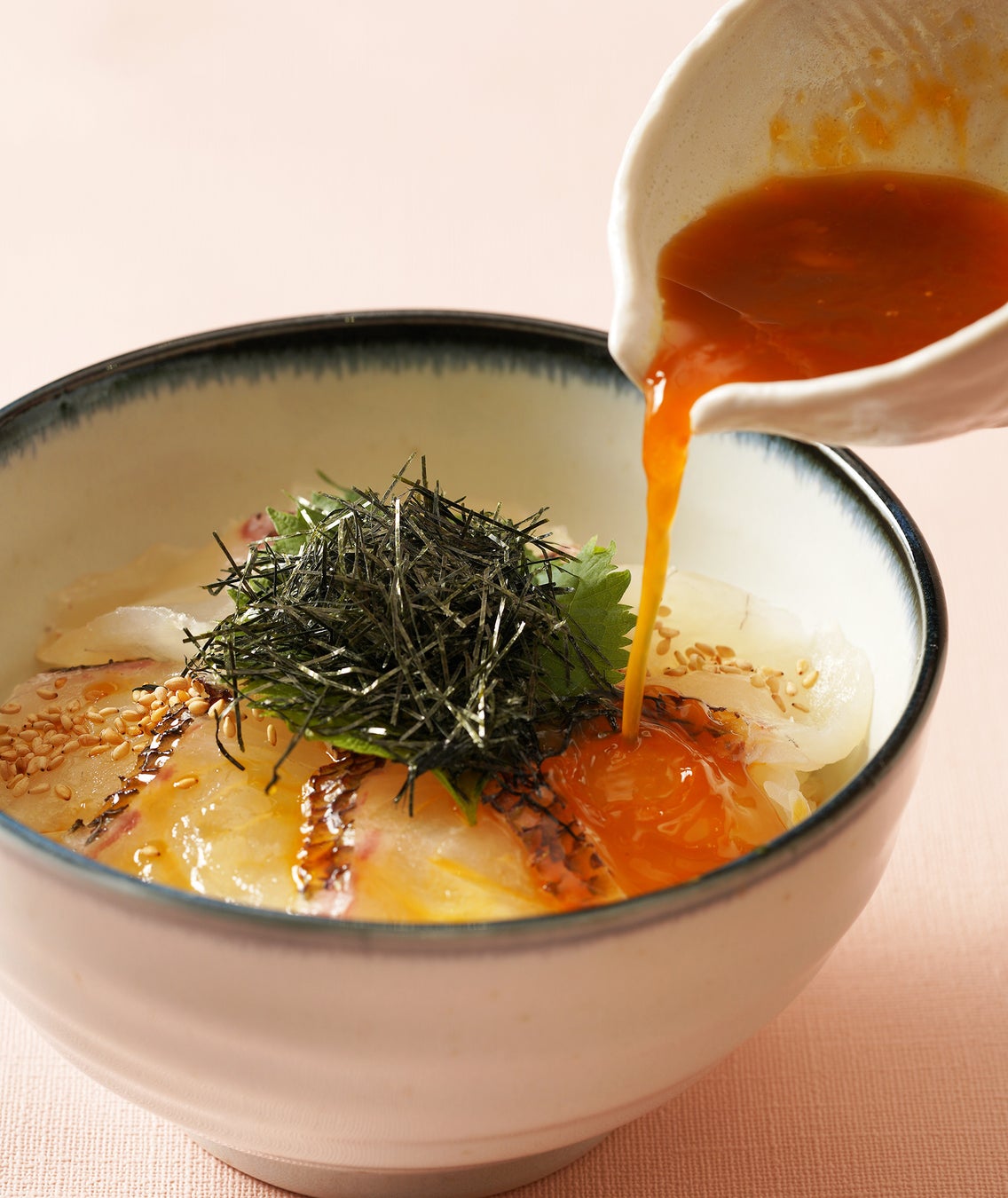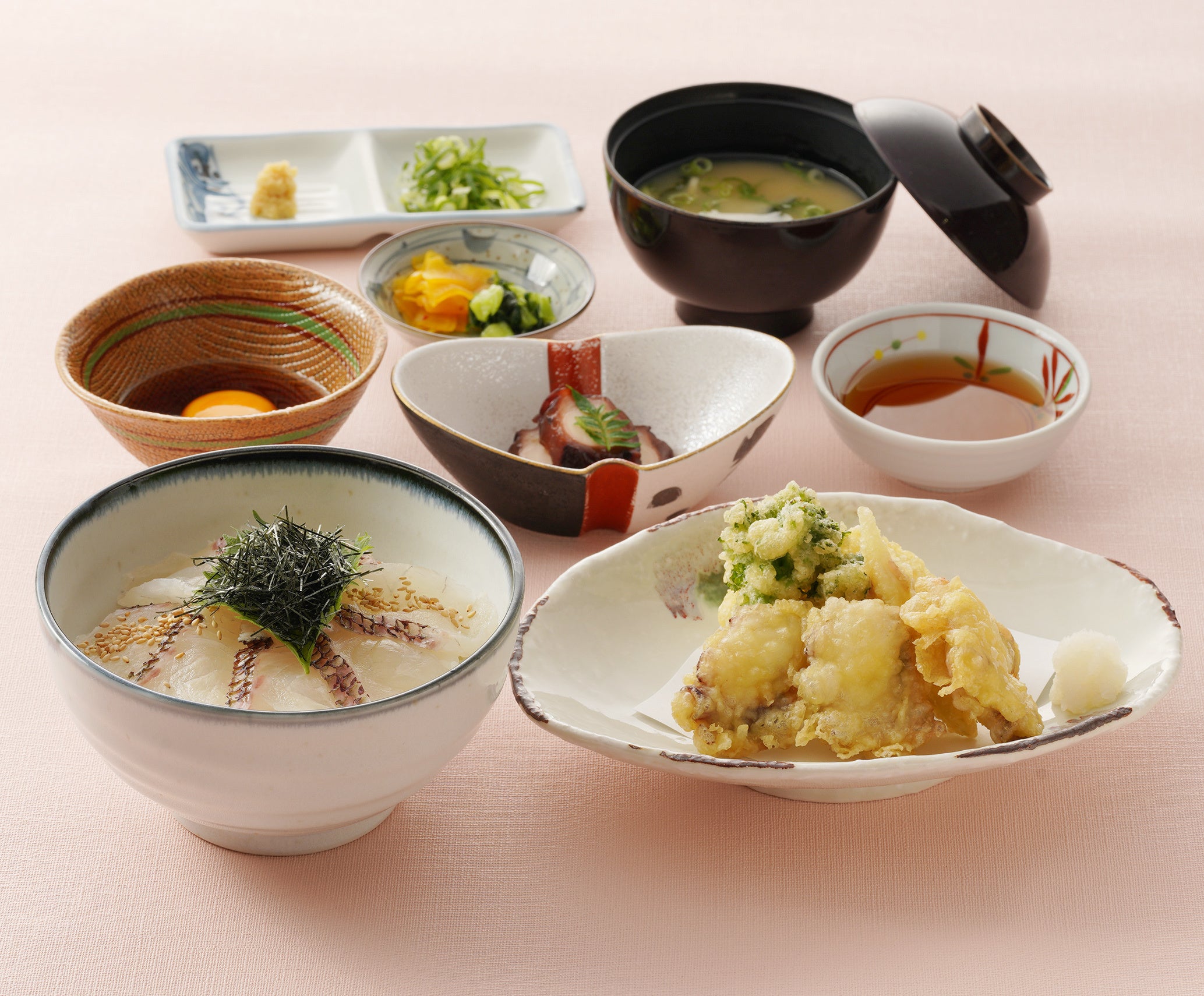 淡路島産の真蛸を柔らか煮と天婦羅に仕上げ、旬の桜鯛は自家製の甘だれと生卵で、掛け御飯にしてお召し上がりください。