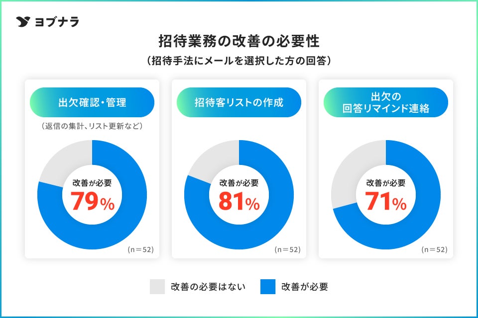 「招待業務の改善の必要性」を尋ねたところ、メールで招待している70%以上が「業務改善が必要」と回答しました。