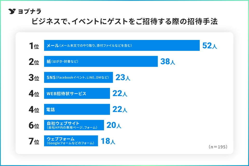 一方で、「WEB招待状」(11%)の利用はまだ限られており、「紙」(19%)や「SNS」(12%)など、従来から使われている手段がいまだ一定の割合を占めていることがわかりました。